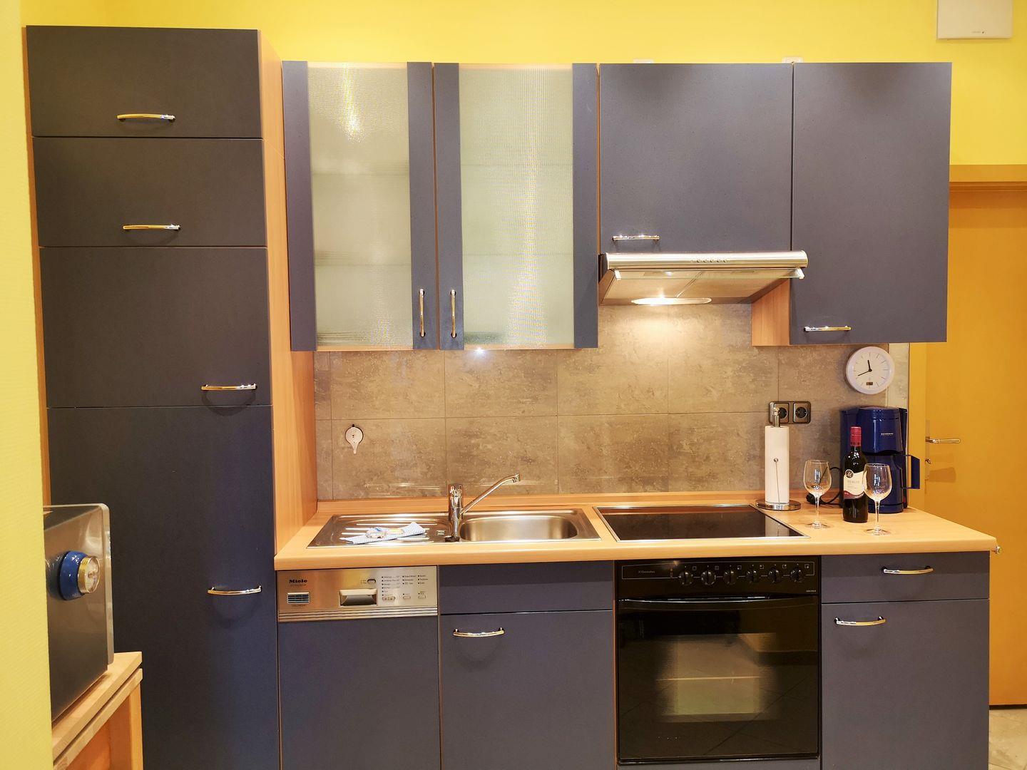 Die offene Küche beinhaltet eine voll ausgestattete Einbauküchenzeile mit 4-Platten-Ceran-Kochfeld, Backofen, Dunstabzug, Mikrowelle, Kühlschrank mit Gefrierfach, Geschirrspülmaschine, Kaffeemaschine, Kaffeeautomat (mit Tabs), Wasserkocher und Toaster. Die Küche ist mit Geschirr, Gläsern, Besteck und Töpfen bestens und ausreichend ausgestattet.