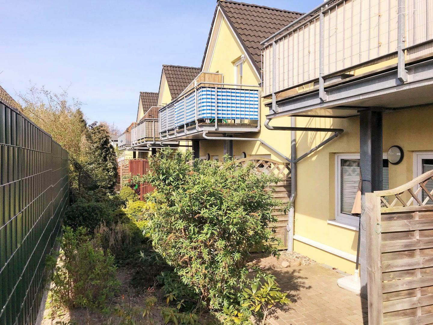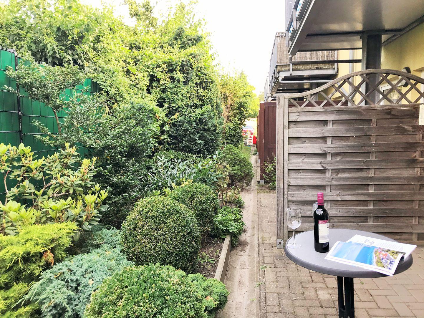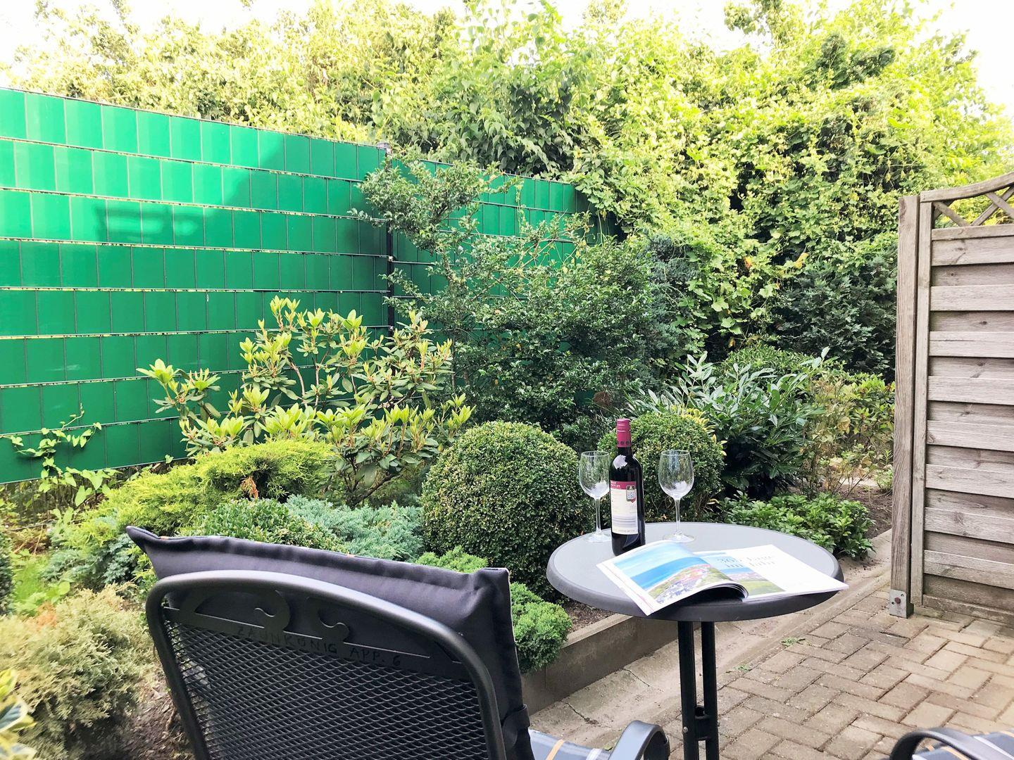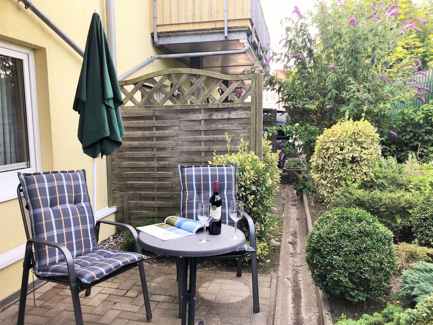 Die Ferienwohnung verfügt über eine ebenerdige, nach Süd-Westen bzw. Westen ausgerichtete, ca. 6 m² große und teilweise überdachte Terrasse (mit Gartenmöbeln), die Sie vom Schlafzimmer aus erreichen. Hier sitzen Sie entspannt und gemütlich im Grünen und können abends bei einem guten Glas Wein in Ruhe die lauen Sommernächte genießen!