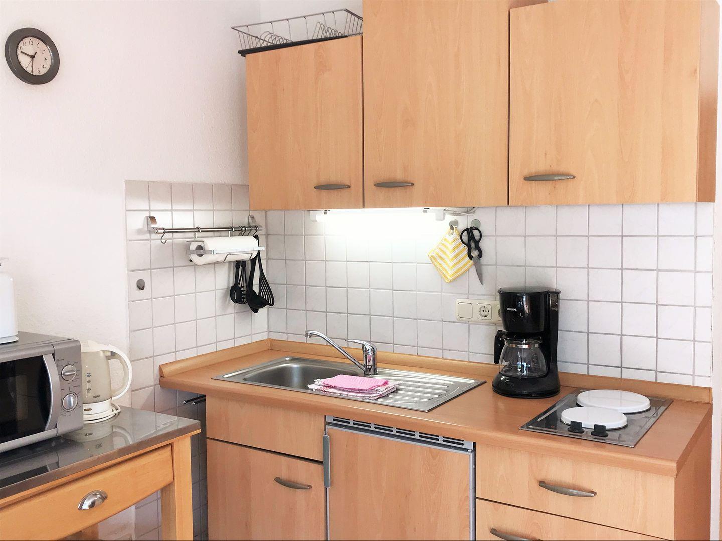 Die offene Küche beinhaltet eine voll ausgestattete Einbauküchenzeile mit 4-Zonen-Ceran-Kochfeld, Dunstabzug, Mikrowelle mit Backfunktion, Kühlschrank mit Gefrierfach, Geschirrspülmaschine, Kaffeemaschine, Wasserkocher und Toaster. Die Küche ist mit Geschirr, Gläsern, Besteck und Töpfen komplett ausgestattet.