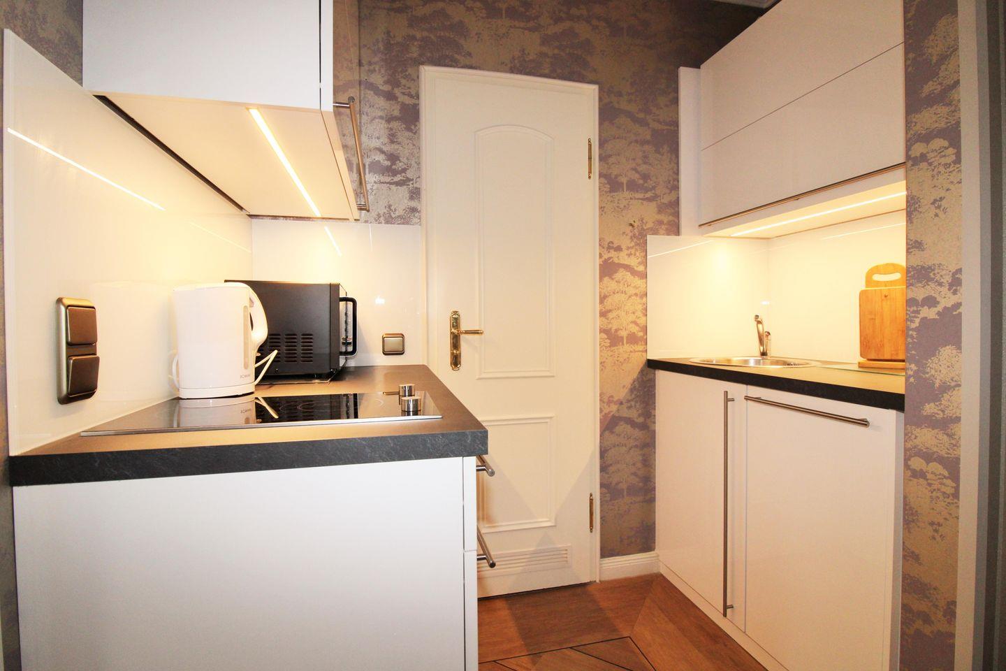 Die offene Pantry-Küche beinhaltet eine Einbauküchenzeile mit 2-Platten-Ceran-Kochfeld, Kühlschrank, Geschirrspüler, Kaffeemaschine, Wasserkocher und Toaster. Die Küche ist mit Geschirr, Gläsern, Besteck und Töpfen vollständig ausgestattet.