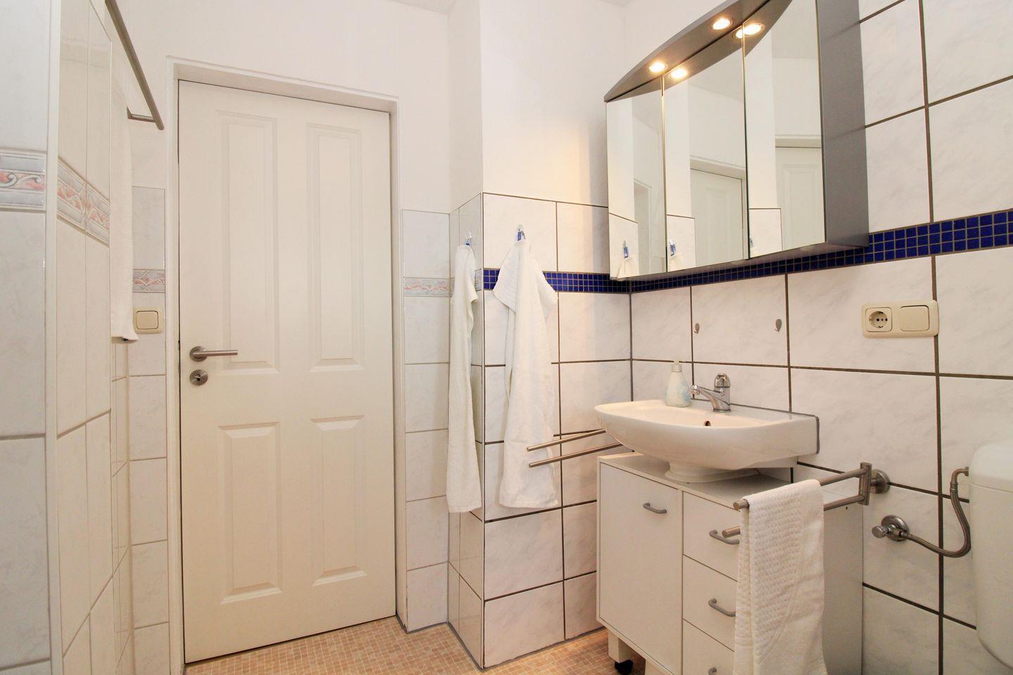 Das helle Badezimmer (mit Tageslicht / Fenster) verfügt über eine Dusche, ein Waschbecken mit Unterschrank, einen Spiegelschrank, einen Handtuchheizkörper sowie ein WC.