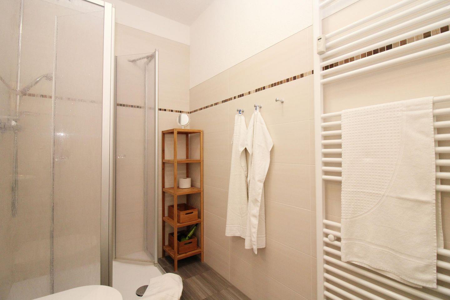 Das moderne Badezimmer verfügt über eine Dusche mit niedrigem Einstieg, Waschbecken, WC, Kosmetikspiegel, Föhn, Handtuch-Heizkörper sowie ausreichend Ablagemöglichkeiten.