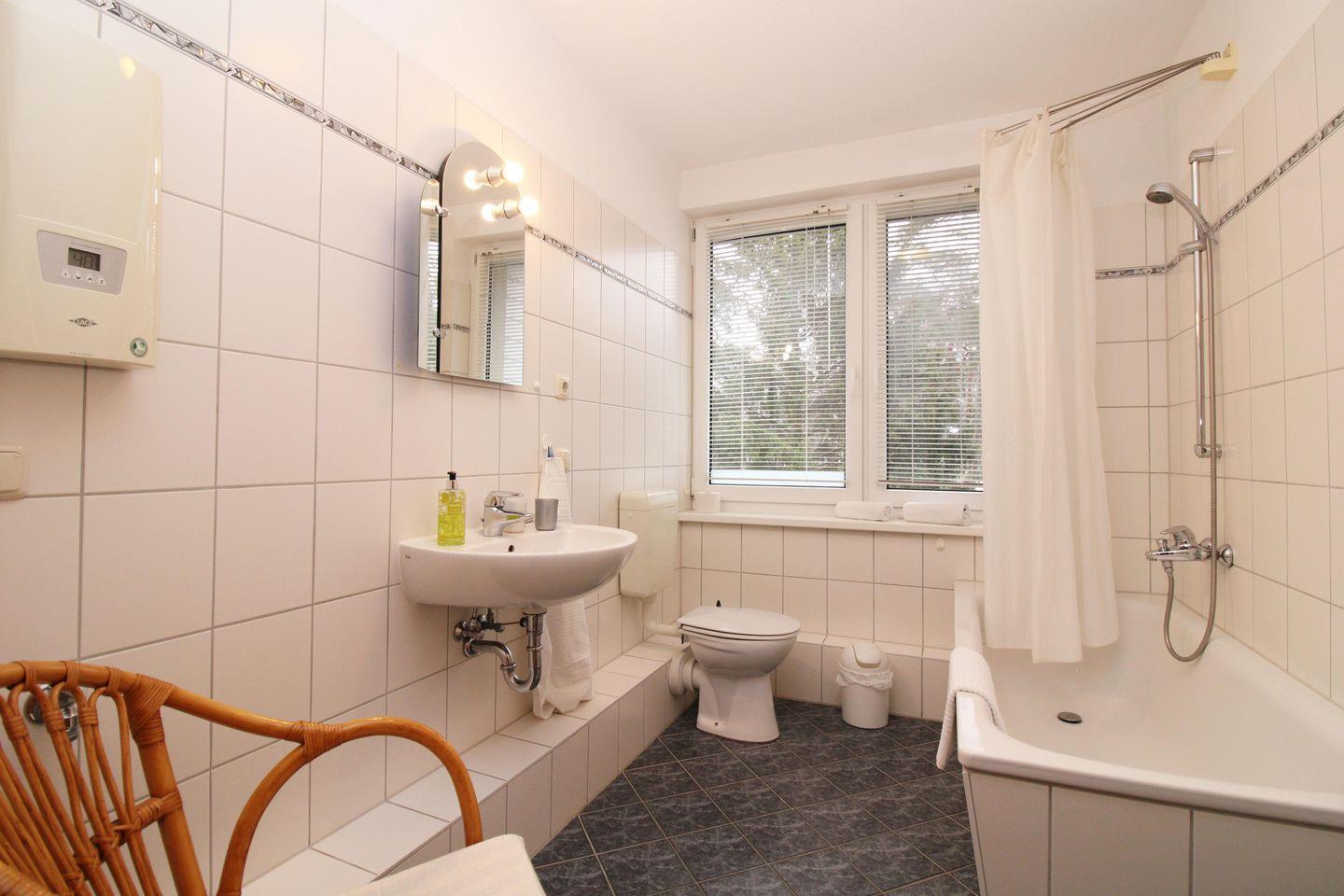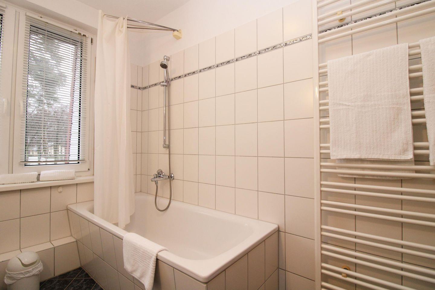 Das helle und geräumige Badezimmer (mit Tageslicht / Fenster) verfügt über eine Badewanne mit Duschmöglichkeit, Waschbecken und WC, einen Handtuch-Heizkörper sowie ausreichend Ablagemöglichkeiten.