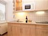 Die halb offene Küche beinhaltet eine voll ausgestattete Einbauküchenzeile mit 4-Zonen-Ceran-Kochfeld, (Mini-)Backofen, Dunstabzug, Mikrowelle, Kühlschrank mit Gefrierfach, Kaffeemaschine, Wasserkocher und Toaster. Die Küche ist mit Geschirr, Gläsern, Besteck und Töpfen komplett ausgestattet.