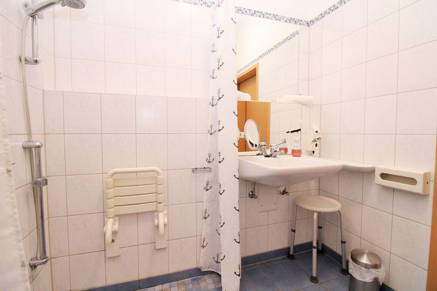 Das große und helle Badezimmer verfügt über eine behindertengerechte und rollstuhl-geeignete (ebenerdige) Dusche, Waschbecken, WC, Kosmetikspiegel, Föhn sowie ausreichend Ablagemöglichkeiten. Ein fest in der Dusche integrierter Duschstuhl steht ebenfalls zur Verfügung. Das Waschbecken ist für Rollstuhlfahrer unterfahrbar und es gibt einen zusätzlichen niedrigen Wandspiegel, damit sowohl sitzende als auch stehende Personen sich gut sehen können. Neben der Toilette befindet sich ein fest integrierter Haltegriff.