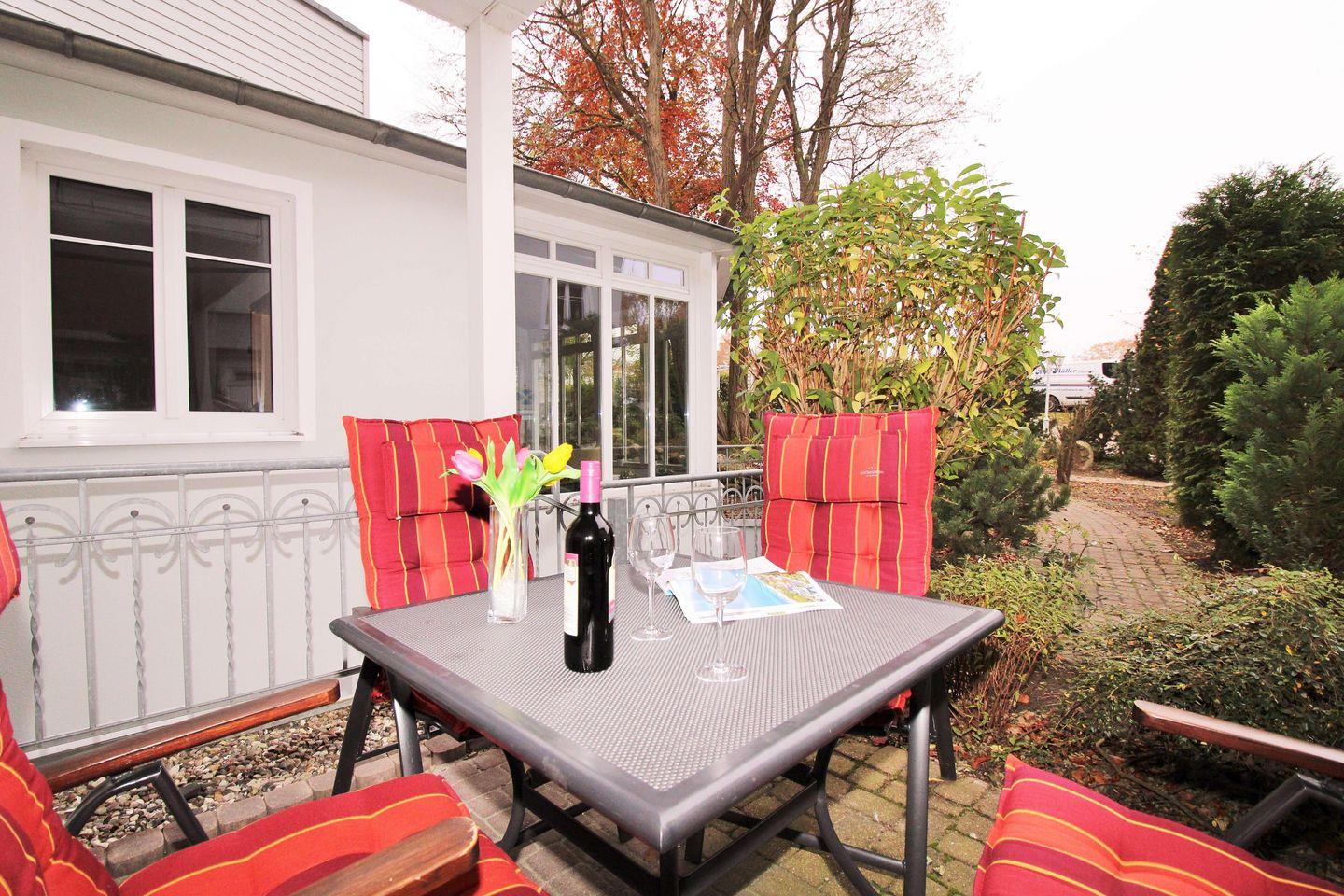 Das gemütliche und helle Wohn-/Esszimmer verfügt über eine separate Sitzgruppe mit bequemer (Schlaf-)Couch, 2 Sesseln und Couchtisch, einen separaten Esstisch mit Stühlen, einen Schreibtisch sowie eine kleine Kommode. Vom Wohnzimmer aus haben Sie direkten Zugang zu der ca. 10 m² großen sowie teilweise überdachten Terrasse (nach Westen ausgerichtet) mit Terrassenmöbeln. Hier sitzen Sie entspannt und gemütlich im Grünen und können abends bei einem guten Glas Wein in Ruhe die lauen Sommernächte genießen!