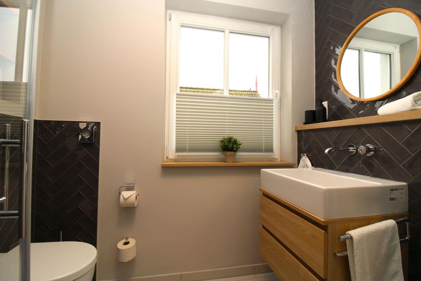 Das moderne und exklusive Badezimmer (mit Tageslicht / Fenster) verfügt über eine Dusche mit bodengleichem Einstieg (seniorenfreundlich!) und Echtglas-Abtrennung, einen Designer-Waschtisch mit Unterschrank, Kosmetikspiegel, Föhn, WC, einen Handtuch-Heizkörper sowie ausreichende Ablagemöglichkeiten.