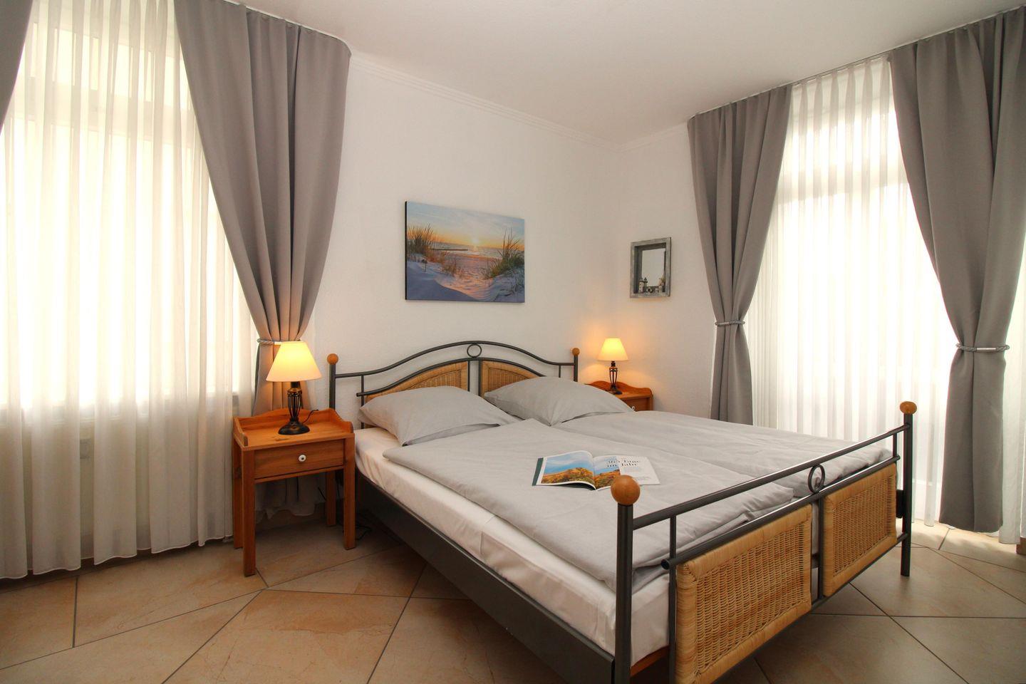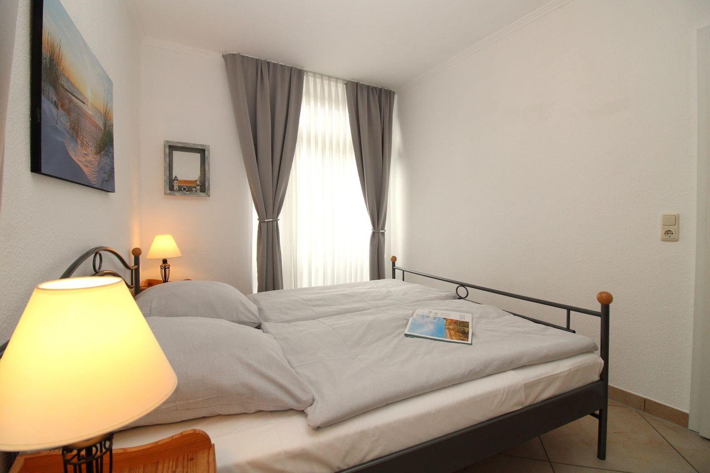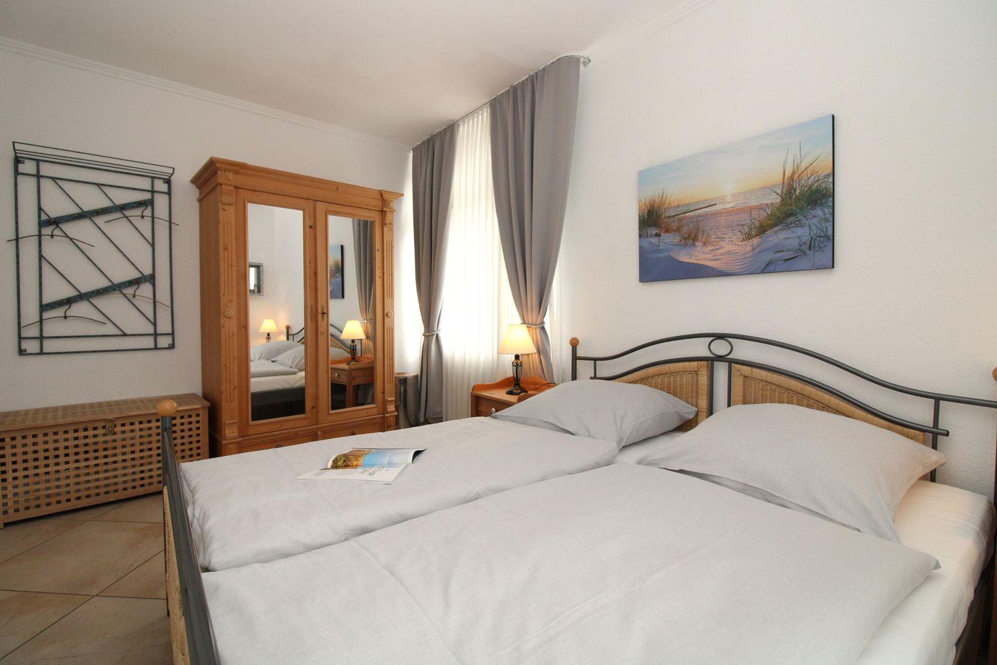 Das gemütliche Schlafzimmer ist mit einem bequemen Doppelbett, Nachttischen, einem geräumigen Kleiderschrank, einer Wäschetruhe sowie einer Wandgarderobe eingerichtet. Eine zusätzliche bequeme Schlafmöglichkeit für eine weitere 3. Person bietet die ausziehbare Schlafcouch im Wohnzimmer.