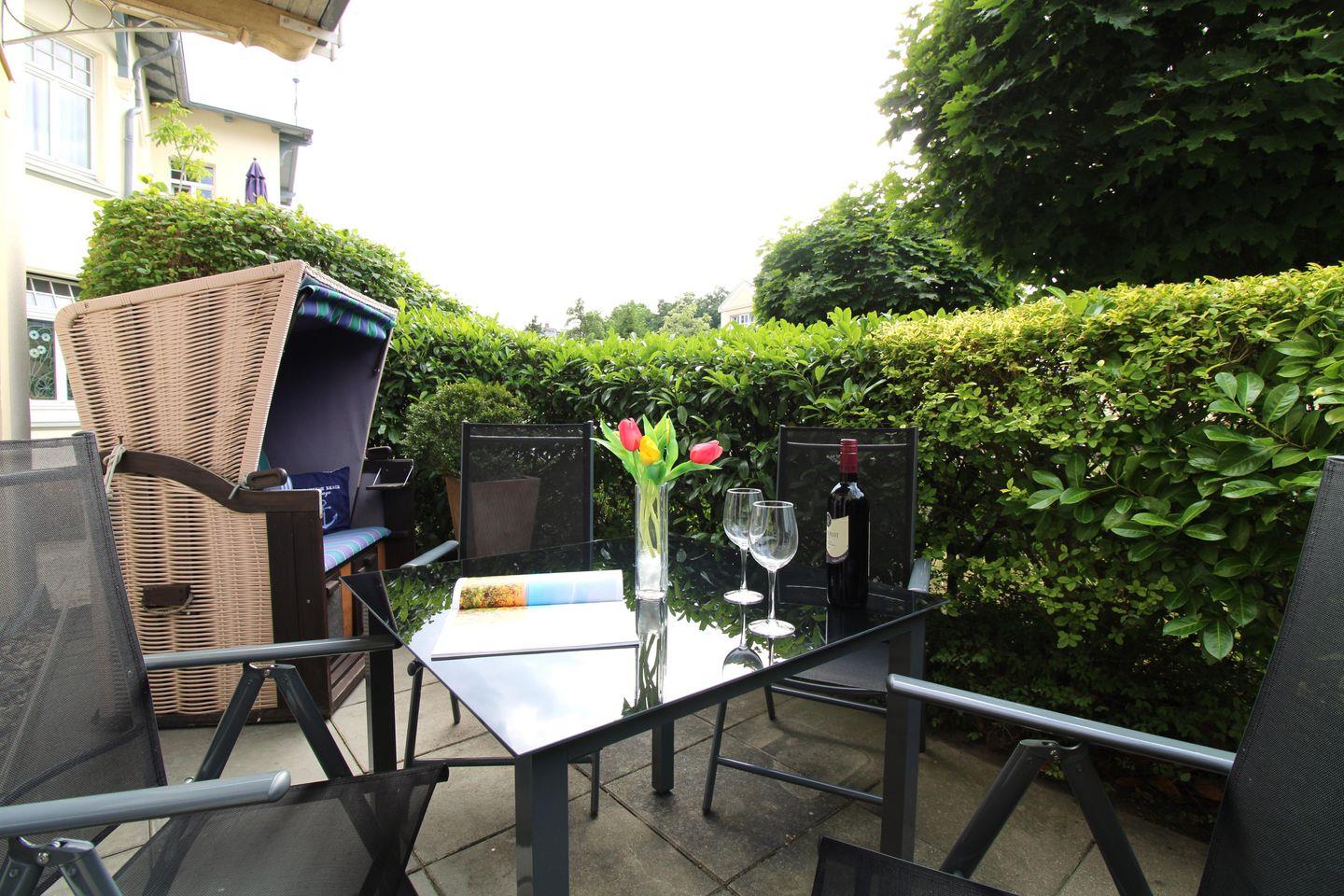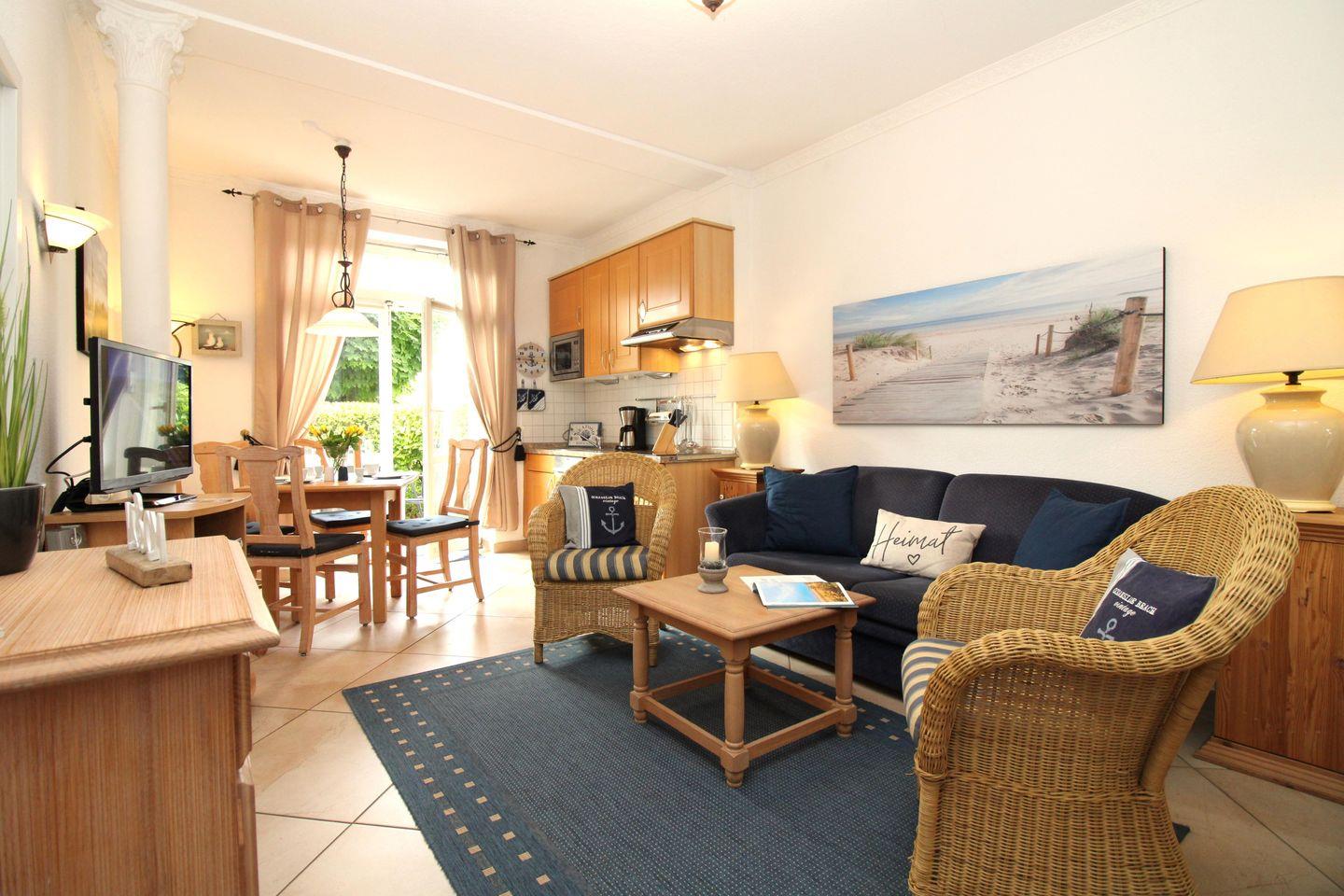 Das freundliche Wohn-/Esszimmer verfügt über eine separate Sitzgruppe mit bequemer, ausziehbarer (Schlaf-)Couch und Couchtisch, 2 bequeme Korbsessel, einen separaten Esstisch mit 4 Stühlen, ein Sideboard sowie 2 Kommoden. Vom Wohnzimmer aus haben Sie direkten Zugang zu der ca. 6 m² großen und sonnigen Terrasse (nach Süd-Westen ausgerichtet) mit Terrassenmöbeln. Hier sitzen Sie entspannt und gemütlich im Grünen und können abends bei einem guten Glas Wein in Ruhe die lauen Sommernächte genießen!