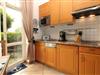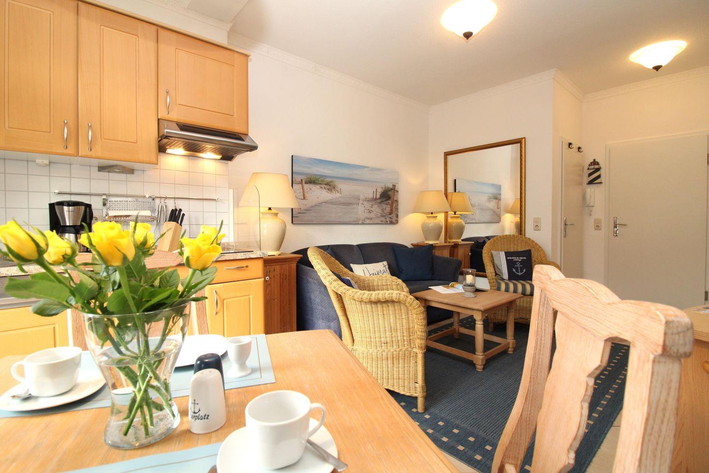 Die offene Küche beinhaltet eine voll ausgestattete Einbauküchenzeile mit 2-Platten-Ceran-Kochfeld, Mikrowelle, Dunstabzug, Kühlschrank mit Gefrierfach, Geschirrspülmaschine, Kaffeemaschine, Wasserkocher und Toaster. Die Küche ist mit Geschirr, Gläsern, Besteck und Töpfen komplett ausgestattet.