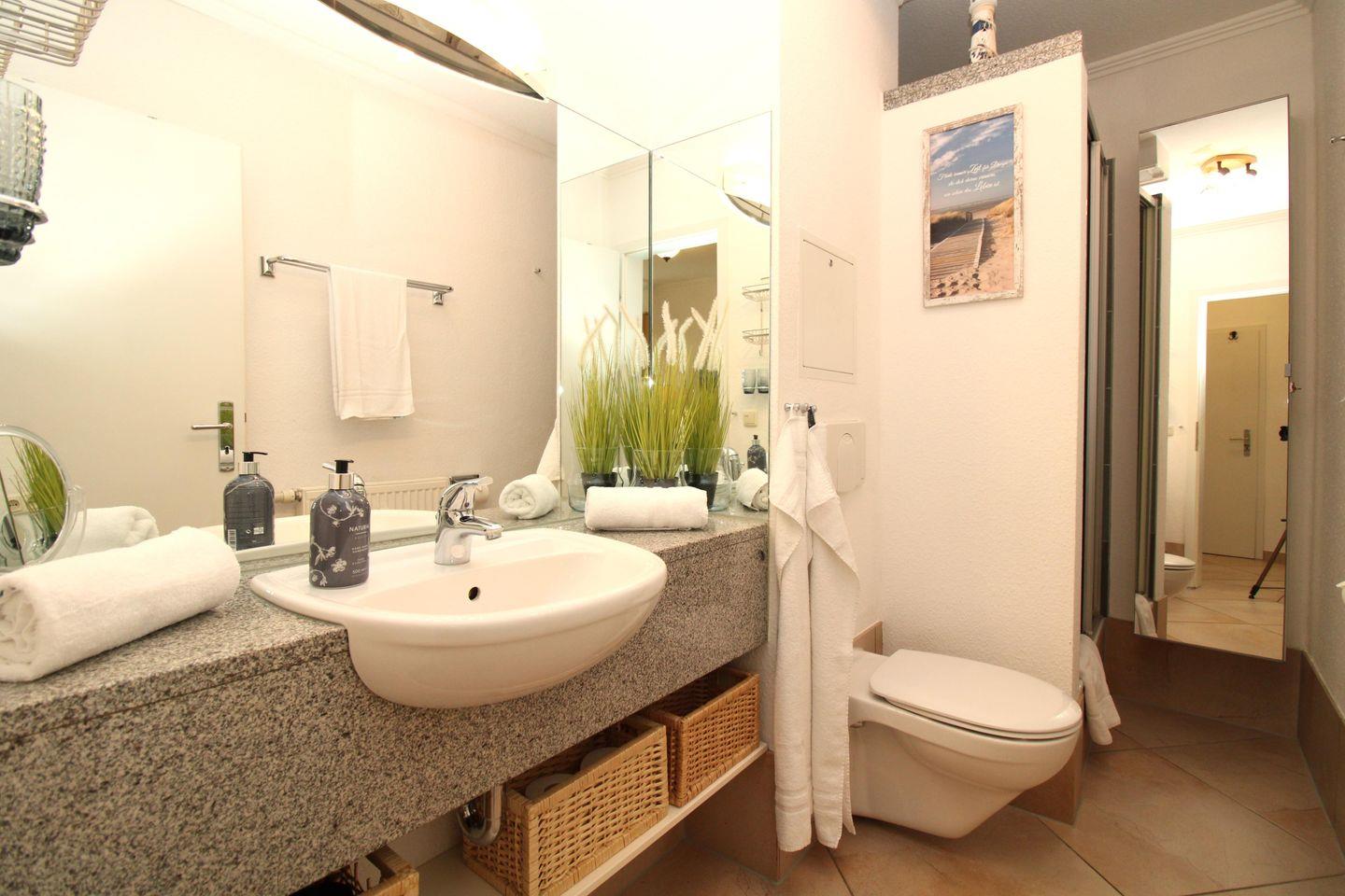 Das moderne Badezimmer verfügt über eine Dusche, Waschbecken mit großem Waschtisch und großem Wandspiegel, Kosmetikspiegel, Föhn, WC sowie ausreichend Ablagemöglichkeiten.