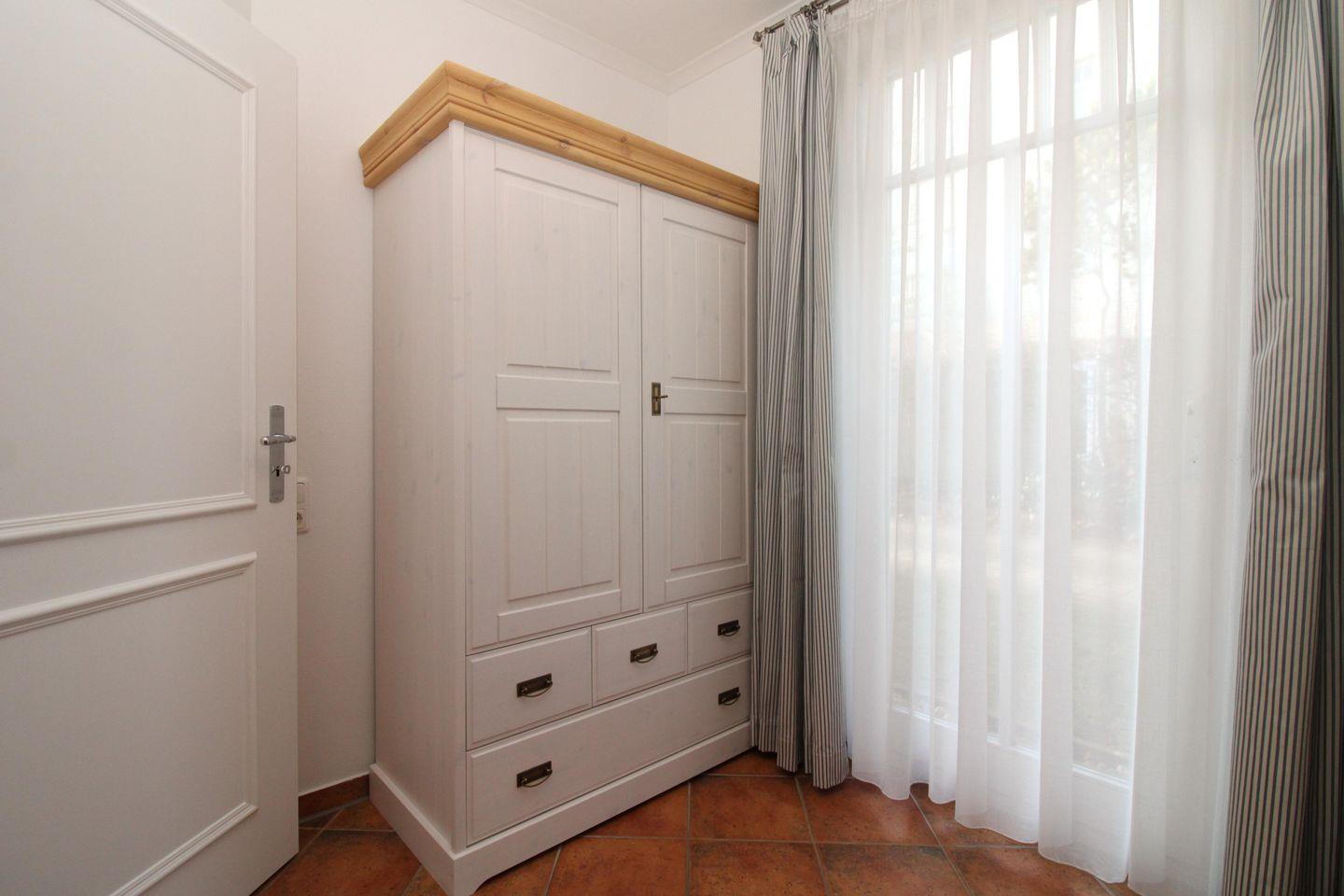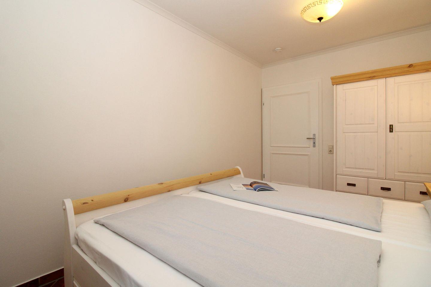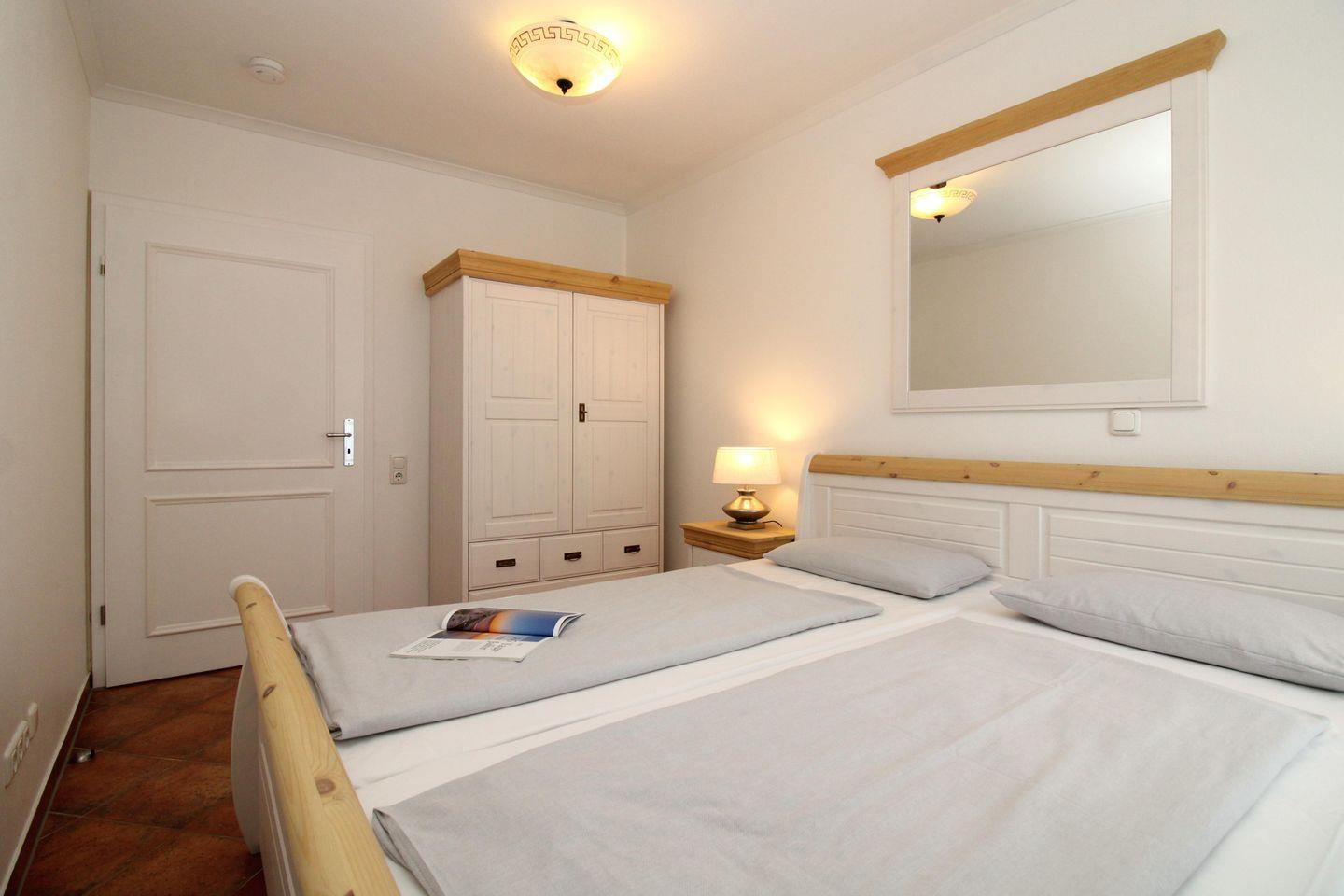 Das Schlafarrangement umfasst ein mit neuen Möbeln ausgestattetes Hauptschlafzimmer mit einem bequemen Doppelbett, Nachttischen und einem geräumigen Schrank sowie ein 2. Schlafzimmer, das ebenfalls im maritimen Stil gestaltet ist und über einen geräumigen Schrank und ein Etagenbett für zwei Personen verfügt. Für Kleinkinder stellen wir Ihnen bei Bedarf (gegen ein geringes Entgelt) zusätzlich auch gerne ein Kinderreisebett (ohne Matratze, Bettdecke, Kissen und Bezüge) sowie einen Kinderhochstuhl zur Verfügung.