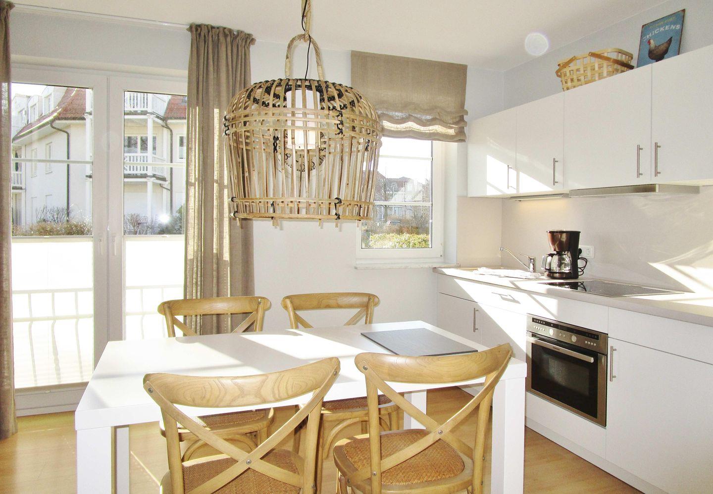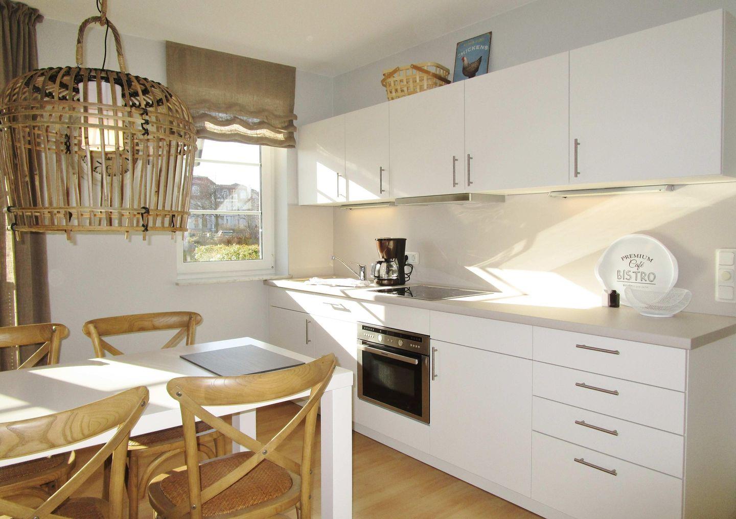 Die moderne offene Küche beinhaltet eine voll ausgestattete Einbauküchenzeile mit 4-Zonen-Ceran-Kochfeld, Backofen, Dunstabzug, Kühlschrank mit Gefrierfach, Geschirr-spülmaschine, Kaffeemaschine, Wasserkocher und Toaster. Die Küche ist mit Geschirr, Gläsern, Besteck und Töpfen bestens und ausreichend ausgestattet.