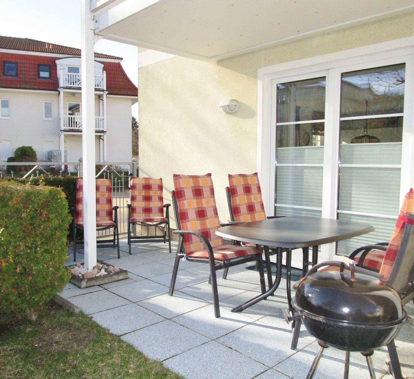 Das lichtdurchflutete, moderne und hochwertig eingerichtete Wohn-/Esszimmer verfügt über eine separate Sitzgruppe mit 2 bequemen 2-Sitzer-Sofas, einen Couchtisch, einen separaten Esstisch mit 4 Stühlen sowie ein Sideboard. Vom Wohnzimmer aus haben Sie direkten Zugang zu der ca. 10 m² großen, sonnigen sowie überdachten Terrasse (nach Süden und Westen ausgerichtet) mit Terrassenmöbeln. Hier sitzen Sie entspannt und gemütlich mitten im Grünen und können bei einem guten Glas Wein die lauen Sommernächte genießen …!