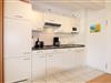Die moderne offene Küche beinhaltet eine voll ausgestattete Einbauküchenzeile mit 2-Platten-Herd, Mikrowelle, Dunstabzug, Kühlschrank, Geschirrspülmaschine, Kaffeemaschine, Wasserkocher und Toaster. Die Küche ist mit Geschirr, Gläsern, Besteck und Töpfen bestens und ausreichend ausgestattet.