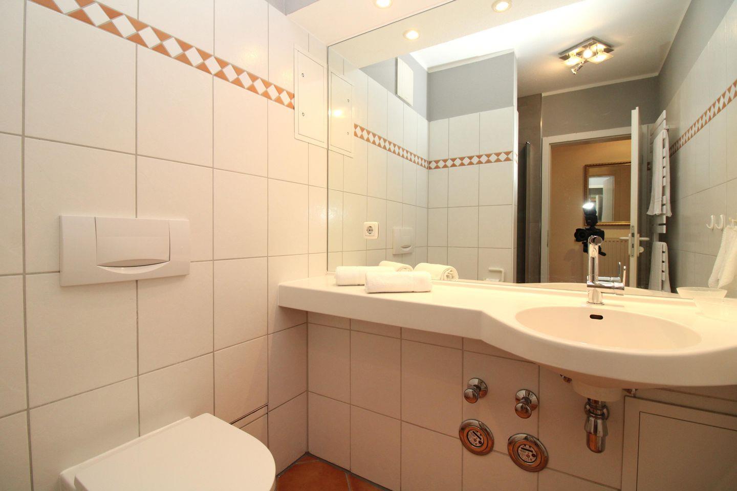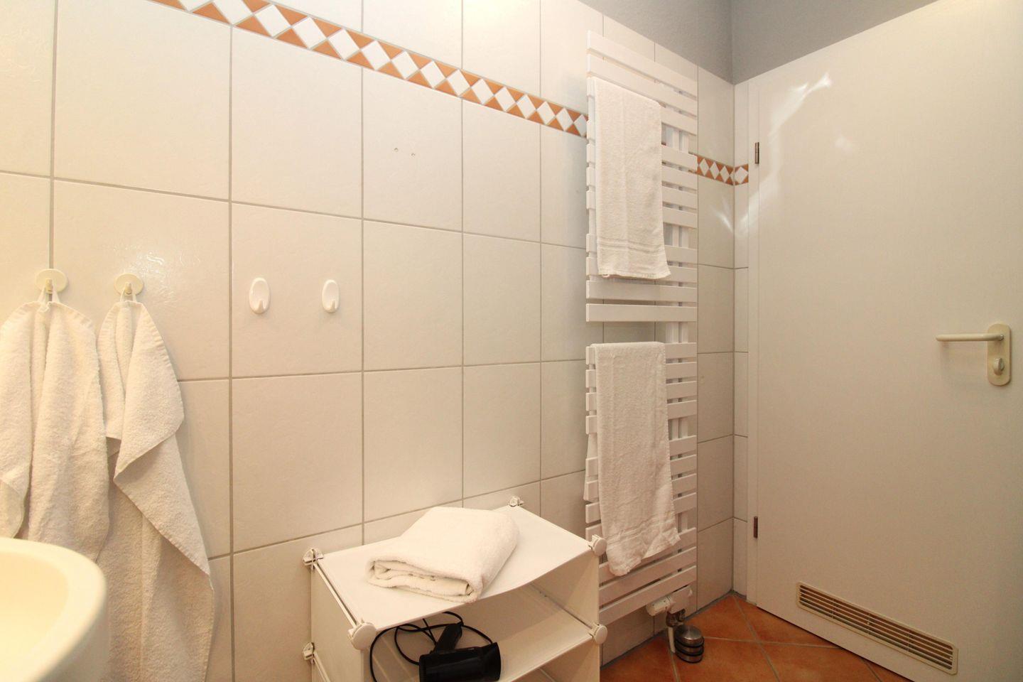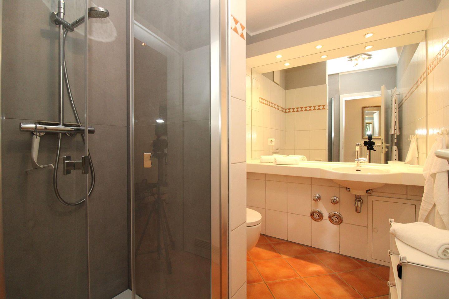 Das freundlich eingerichtete Badezimmer verfügt über eine geräumige Dusche und WC sowie ausreichend Ablagemöglichkeiten.