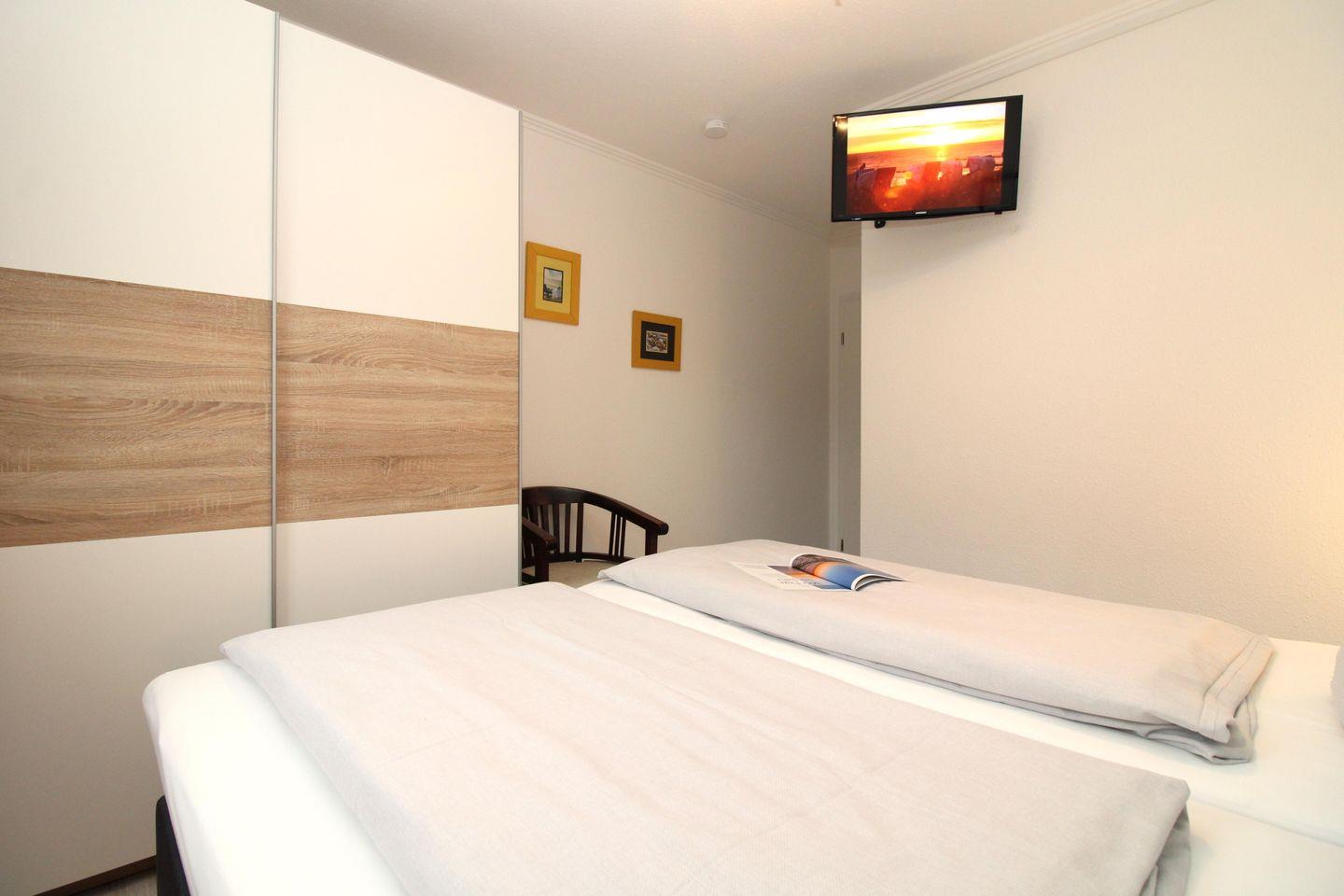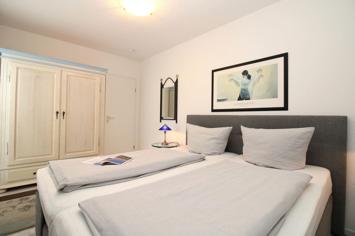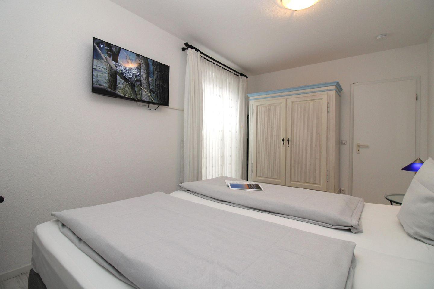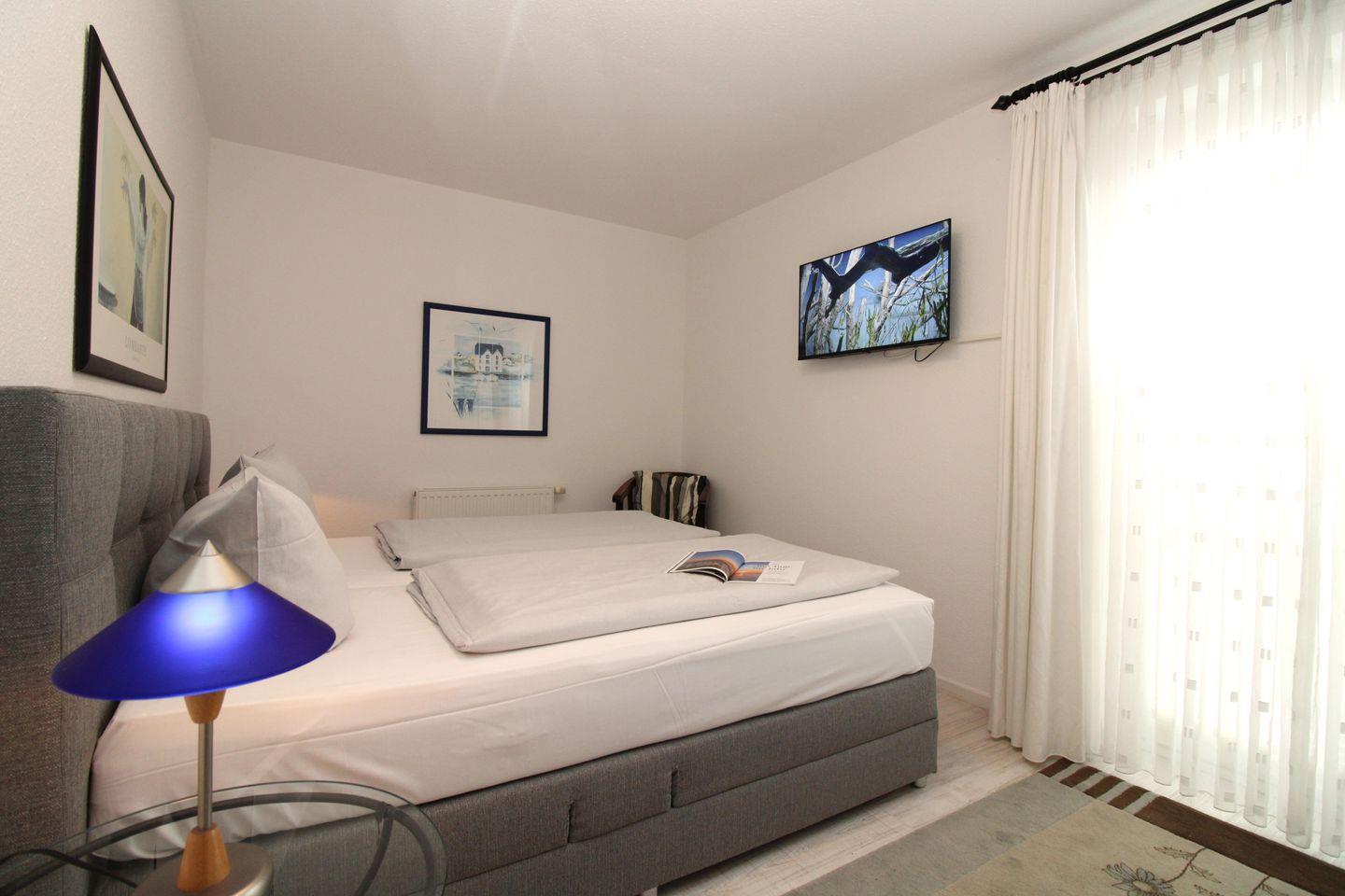 Das lichtdurchflutete 1. Schlafzimmer ist mit einem bequemen Doppelbett, Nachttischen sowie einem geräumigen Kleiderschrank eingerichtet und verfügt über ein zusätzliches TV-Gerät.
