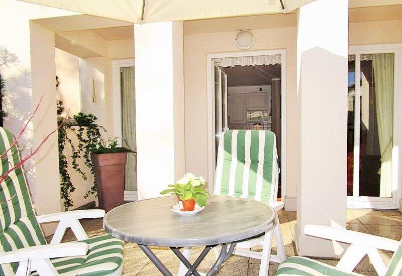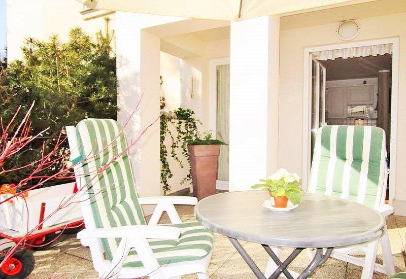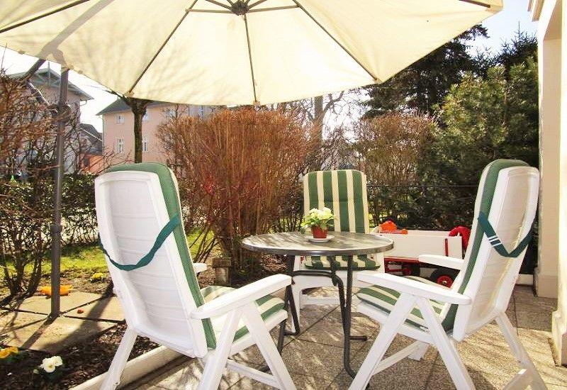 Das moderne und freundliche Wohn-/Esszimmer verfügt über eine separate Sitzgruppe mit Couch, Couchtisch und 2 Sesseln, einen separaten Esstisch mit 4 Stühlen sowie verschiedene Schränke. Vom Wohnzimmer aus haben Sie direkten Zugang zu der ca. 7 m² großen und sonnigen Terrasse (nach Osten und Süden ausgerichtet) mit Gartenmöbeln - hier sitzen Sie entspannt und gemütlich mitten im Grünen und können abends bei einer guten Flasche Wein die lauen Sommernächte genießen!