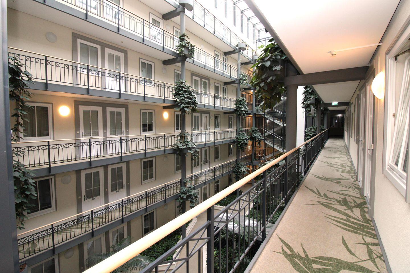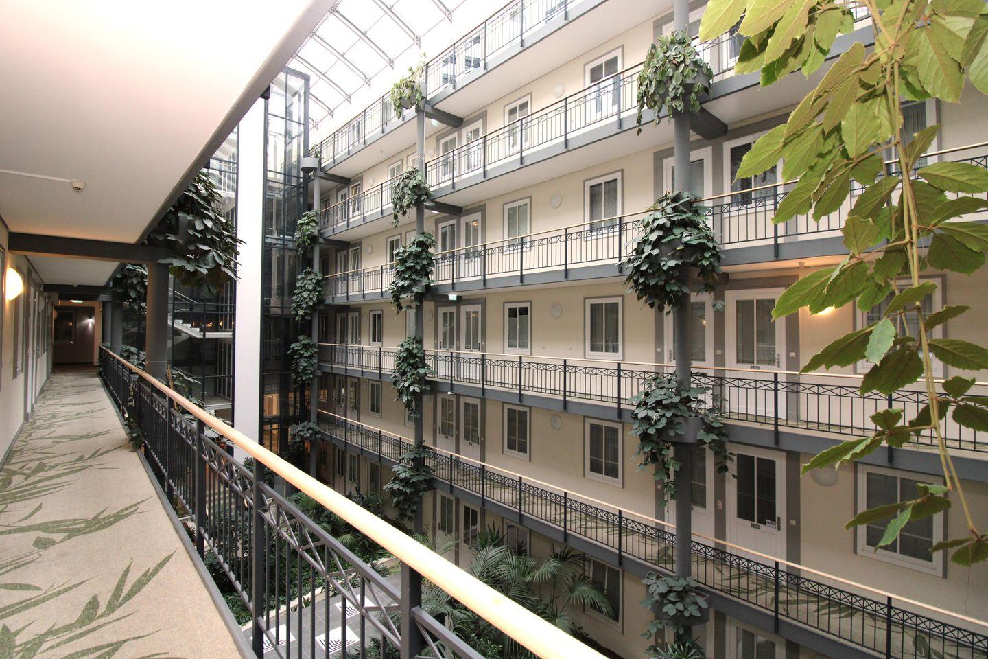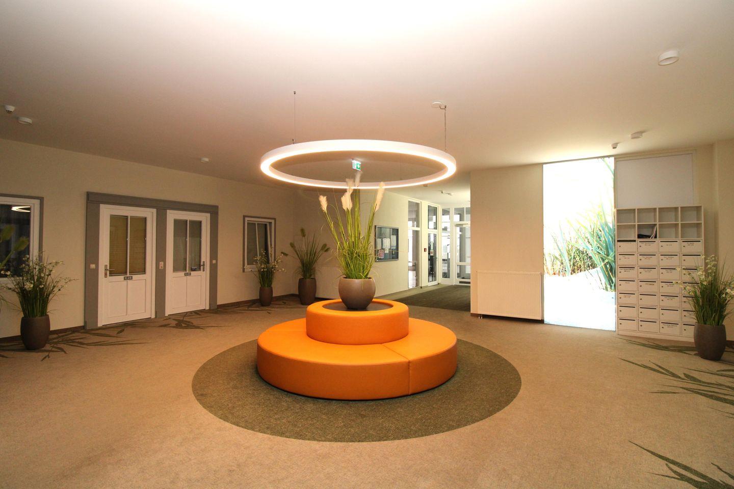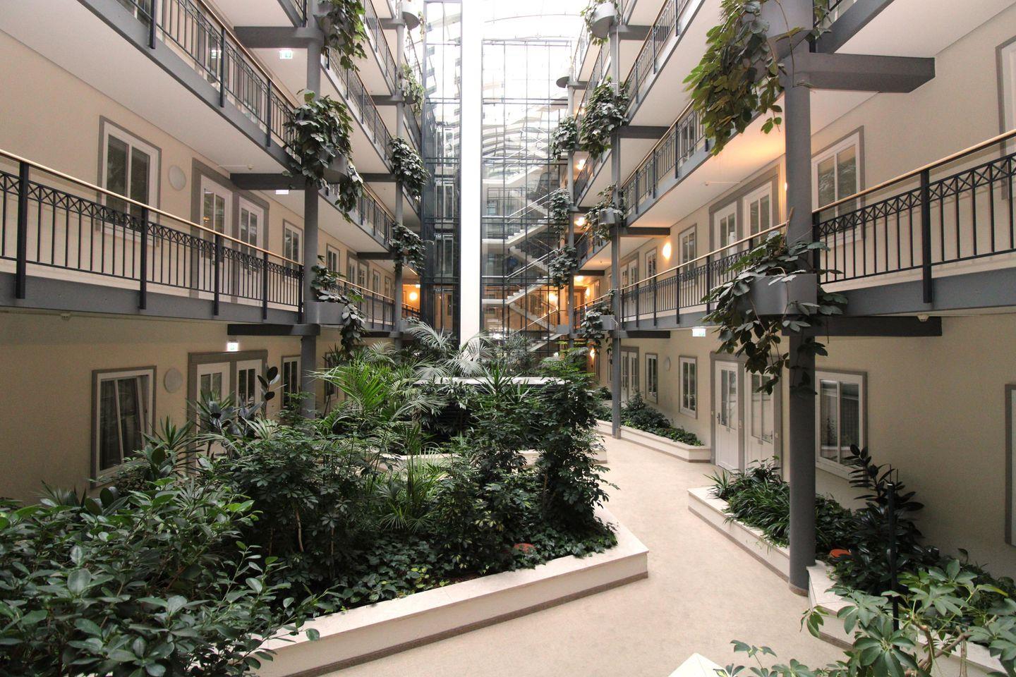 Über ein großzügiges überdachtes Atrium mit Echt-Grünpflanzen im Innenbereich des Appartementhauses gelangen Sie mit einem der gläsernen Fahrstühle barrierefrei und bequem vom Keller bis zu Ihrer Wohnung im 2. OG.