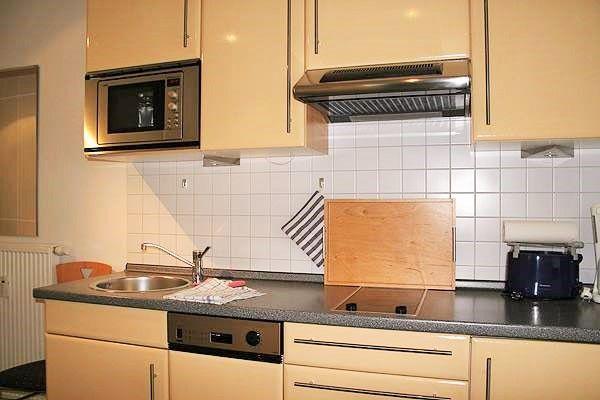Der offene Küchenbereich beinhaltet eine voll ausgestattete Einbauküchenzeile mit 2-Platten-Ceran-Kochfeld, Dunstabzug, Mikrowelle, Kühlschrank mit Gefrierfach, Geschirrspülmaschine, Kaffeemaschine, Wasserkocher und Toaster. Die Küche ist mit Geschirr, Gläsern, Besteck und Töpfen komplett ausgestattet.
