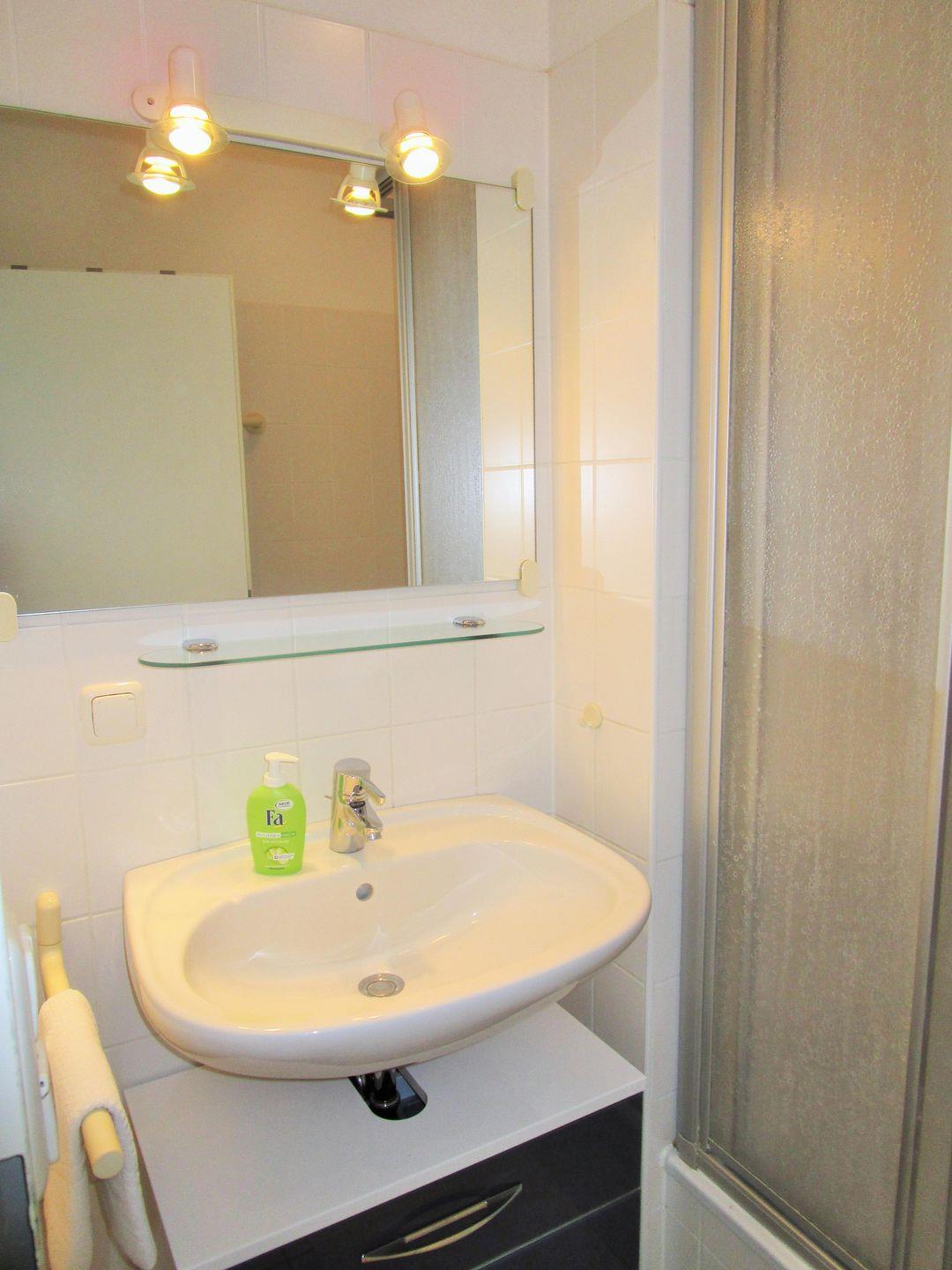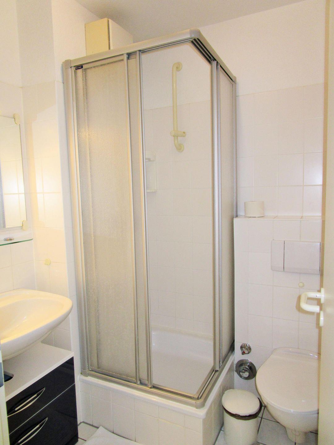 Das helle und freundliche Badezimmer verfügt über eine Dusche, Waschbecken, einen Badezimmerschrank, WC sowie ausreichend Ablagemöglichkeiten.