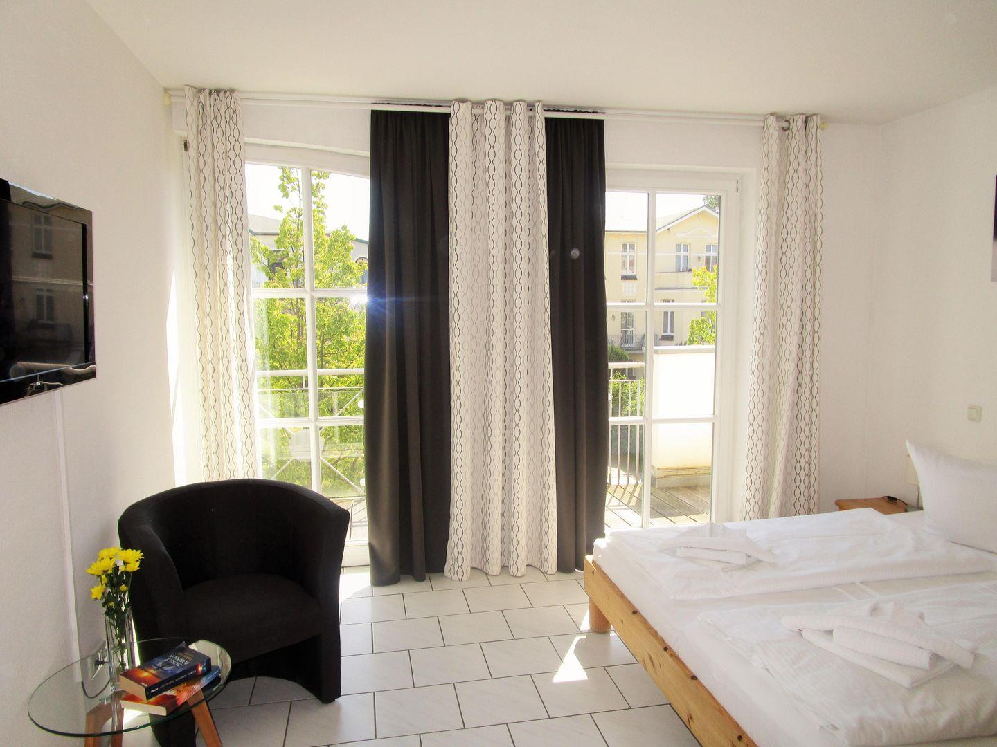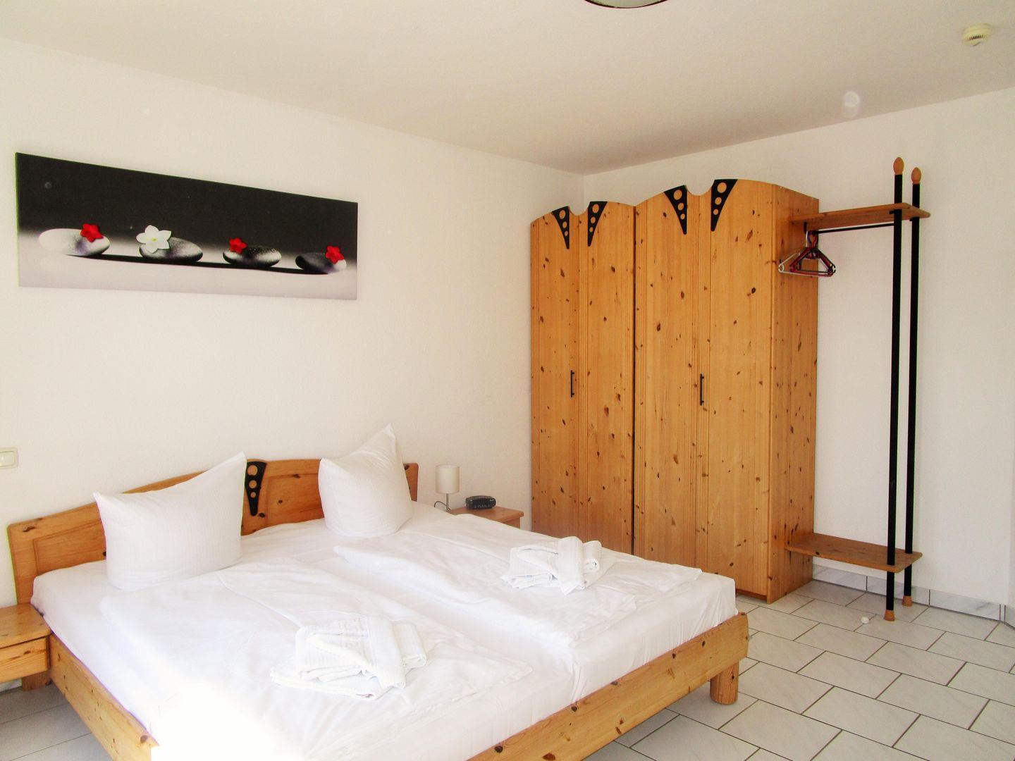 Das großzügige und helle Schlafzimmer ist mit einem bequemen Doppelbett, Nachttischen, zwei Kleiderschränken und einer kleinen Sitzgruppe eingerichtet. Hier steht Ihnen ein weiteres TV-Gerät zur Verfügung. Auch vom Schlafzimmer aus haben Sie Zugang zum Balkon.