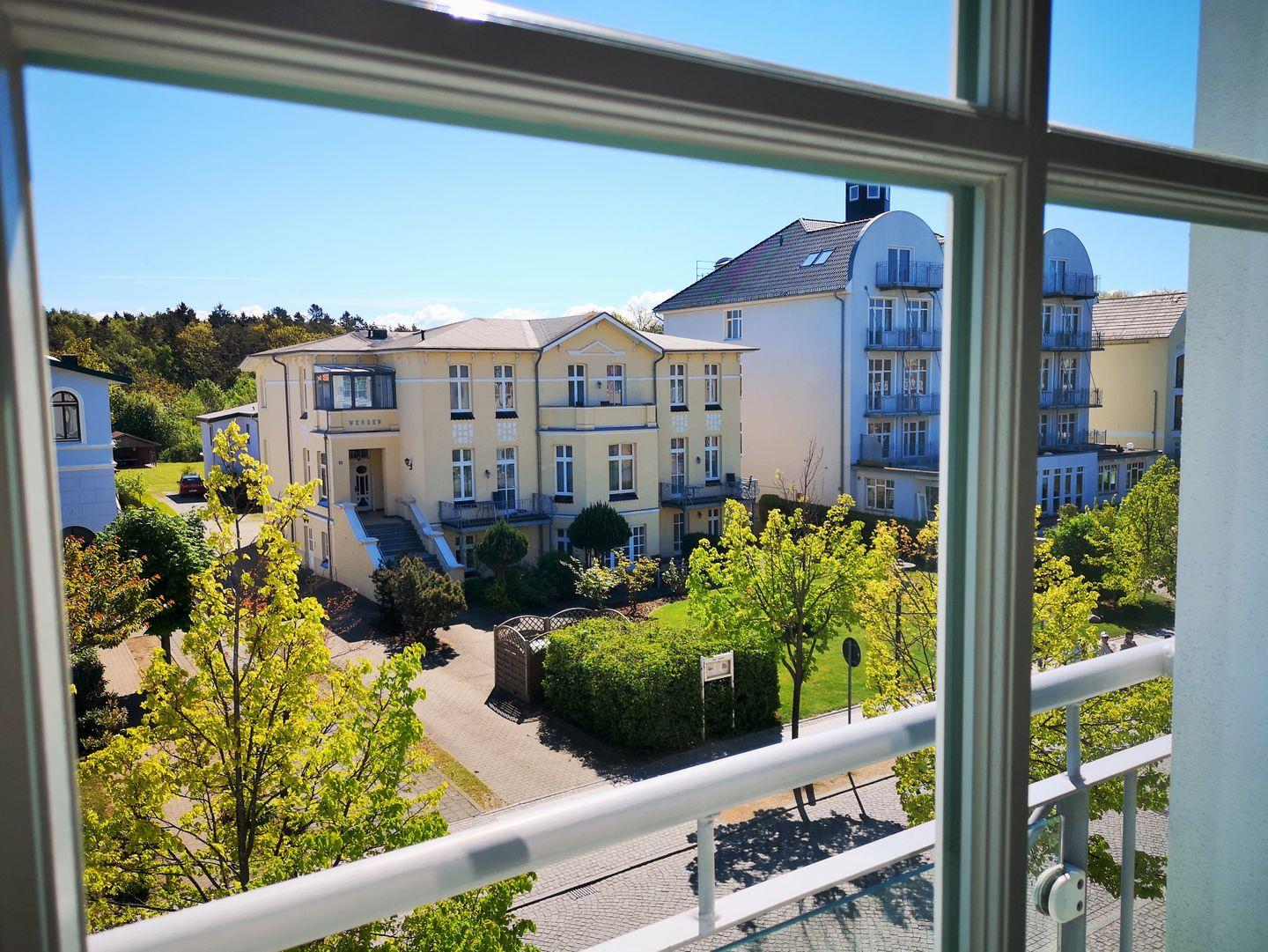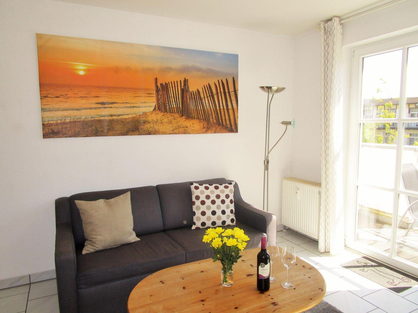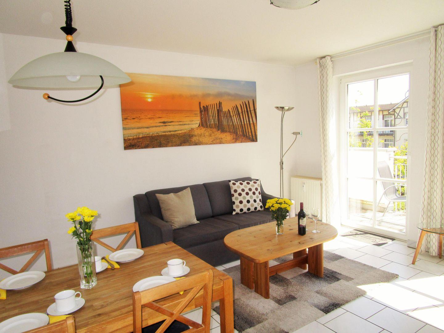 Das helle und geräumige Wohn-/Esszimmer verfügt über eine bequeme Couch, Sessel und Couchtisch, einen separaten Esstisch mit 4 Stühlen sowie ein Sideboard. Von hier aus haben Sie direkten Zugang zu dem ca. 12 m² großen und sonnigen Balkon (nach Osten / Südosten ausgerichtet) mit Balkonmöbeln - hier sitzen Sie entspannt und können den herrlichen seitlichen Blick auf die Ostsee sowie das muntere Treiben auf der Hermannstraße genießen.