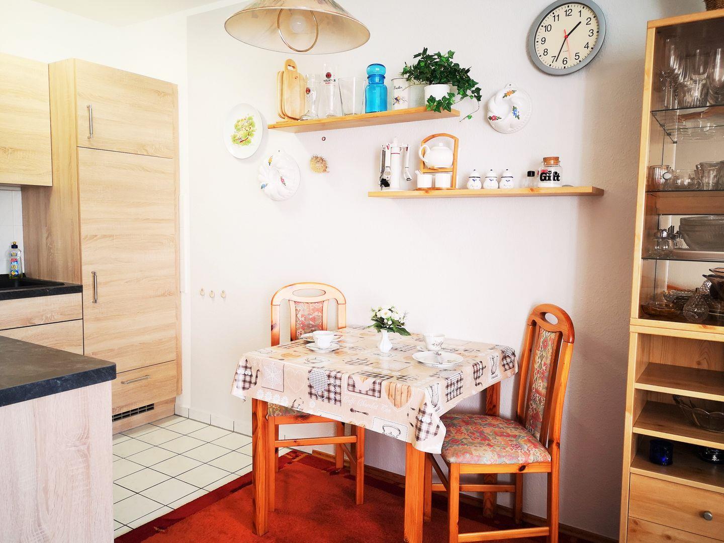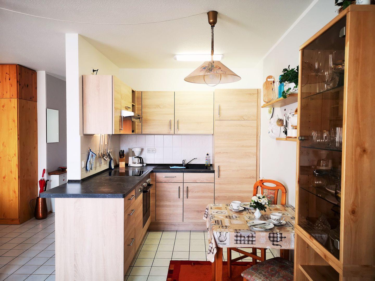 Der offene, räumlich jedoch abgetrennte, Küchen-/Essbereich beinhaltet eine moderne, komplett ausgestattete Einbauküchenzeile mit 4-Platten-Ceranfeld, Herd, Backofen, Mikrowelle, Dunstabzugshaube, Kühlschrank mit Gefrierfach, Geschirrspülmaschine, Kaffeemaschine, Wasserkocher und Toaster. Die Küche ist mit Geschirr, Gläsern, Besteck und Töpfen bestens und ausreichend ausgestattet.