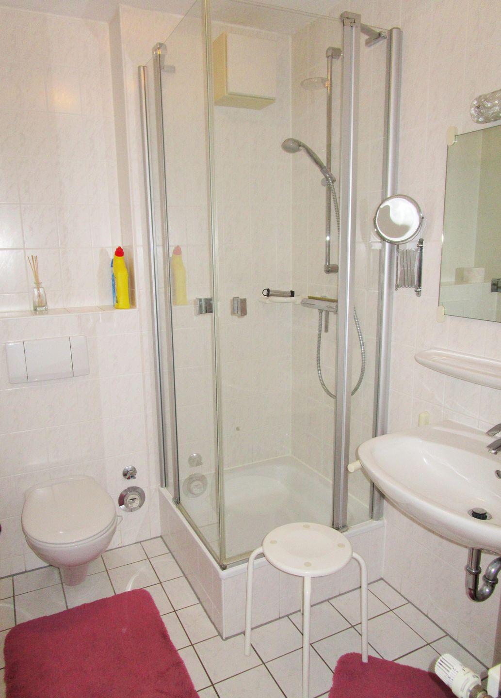 Das helle Badezimmer verfügt über eine Dusche mit Echtglastür, Waschbecken, Föhn, Kosmetikspiegel, WC sowie ausreichend Ablagemöglichkeiten.