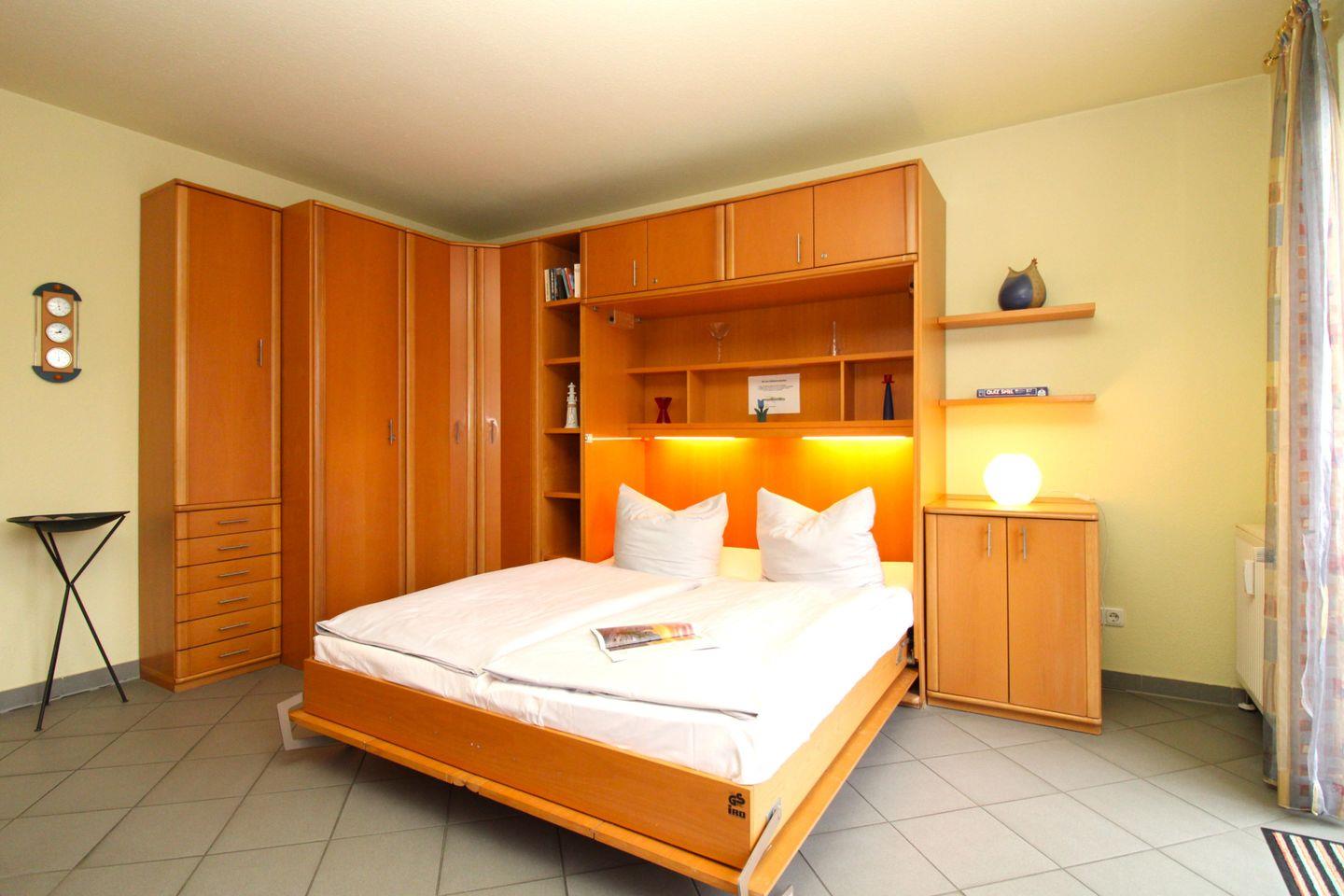Zum Schlafen stehen Ihnen ein komfortables ausklappbares Schrankbett (1,80 m breit) mit bestem Schlafkomfort sowie ausreichend Schrankfläche für Ihre Urlaubsgarderobe zur Verfügung.