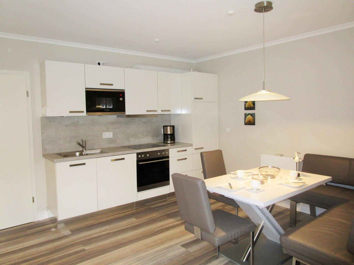 Die moderne offene Küche beinhaltet eine voll ausgestattete Einbauküchenzeile in sehr guter Ausstattung mit 4-Zonen-Ceran-Kochfeld, Backofen, Dunstabzug, Mikrowelle, Kühlschrank mit Gefrierfach, Geschirrspülmaschine, Kaffeemaschine, Nespresso Pixie Kapselmaschine, Wasserkocher und Toaster. Die Küche ist mit Geschirr, Gläsern, Besteck und Töpfen bestens und ausreichend ausgestattet.