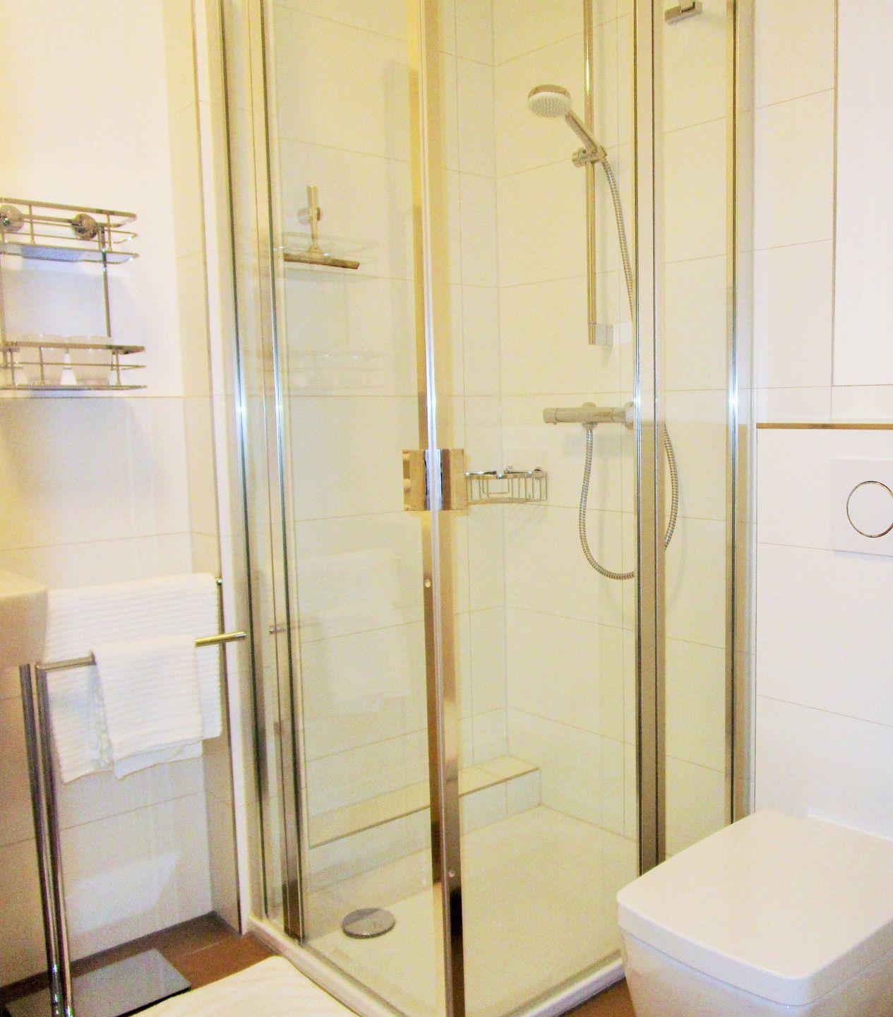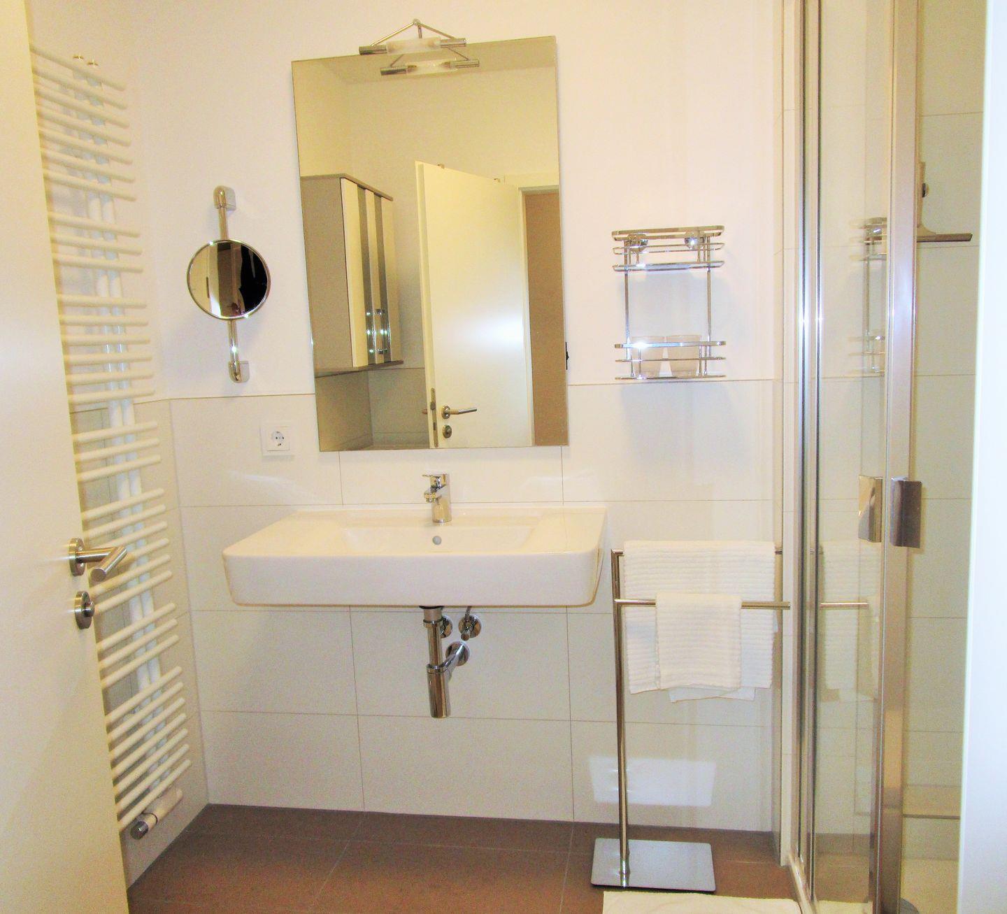 Das moderne und elegante Badezimmer verfügt über eine Dusche mit ebenerdigem Einstieg (seniorenfreundlich(!) und Echtglas-Türen, Waschbecken, Kosmetikspiegel, 2 Schränke, WC, einen Handtuch-Heizkörper sowie ausreichend Ablagemöglichkeiten. Weiterhin steht Ihnen hier eine eigene Waschmaschine zur Verfügung.
