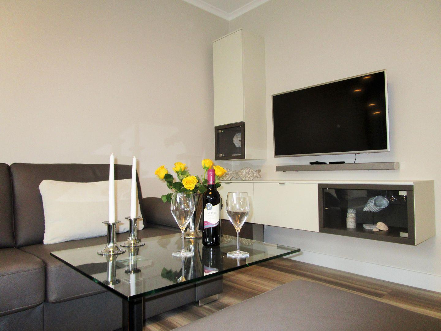 Zu Ihrer Unterhaltung stehen Ihnen im Wohnbereich der Ferienwohnung ein modernes und großes Flachbildschirm-TV-Gerät, Internetradio sowie ein Multi-Funktionslautsprecher (mit USB-Anschluss, Möglichkeit der Musikübertragung von Ihrem Handy, u.ä.) mit Sound-Bar zur Verfügung. Im 1. Schlafzimmer befindet sich ebenfalls ein Flachbildschirm-TV-Gerät. Darüber hinaus verfügt die Wohnung über kostenfreies WLAN.
