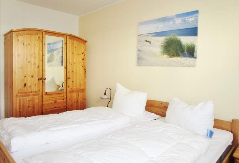 Das helle und freundliche Schlafzimmer ist mit einem bequemen Doppelbett, Nachttischen sowie einem geräumigen Kleiderschrank eingerichtet. Eine zusätzliche bequeme Schlafmöglichkeit für eine weitere 3. bzw. 4. Person bietet die ausziehbare Schlafcouch im Wohnzimmer.
