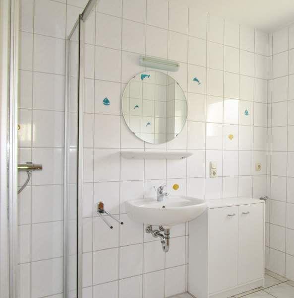 Das Badezimmer (mit Tageslicht / Fenster) verfügt über eine Dusche, Waschbecken, WC, einen Badezimmerschrank sowie ausreichend Ablagemöglichkeiten.