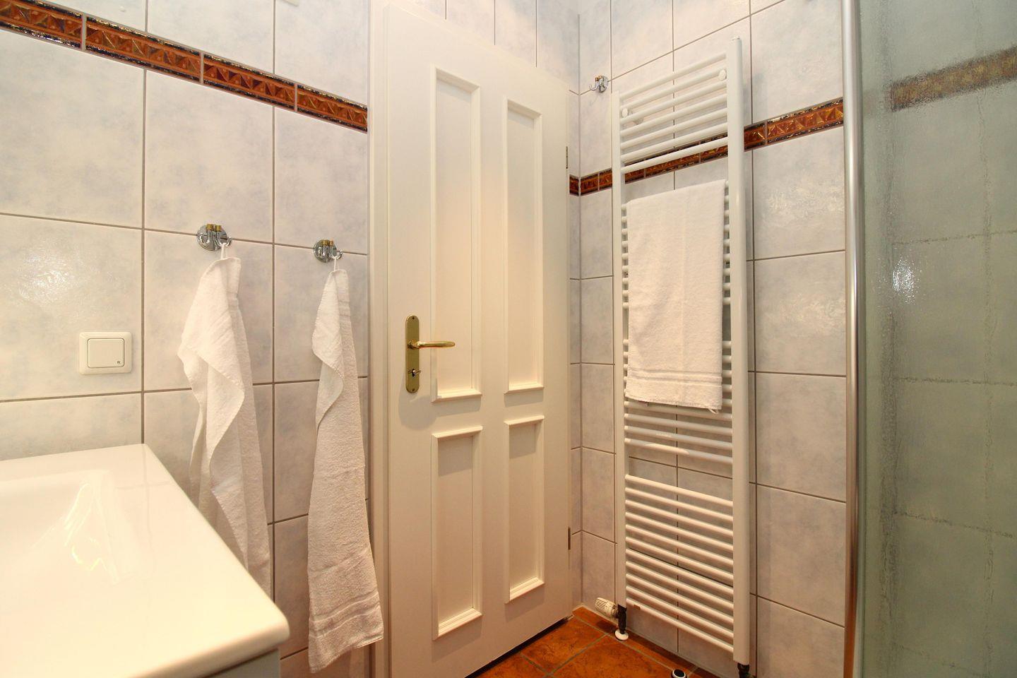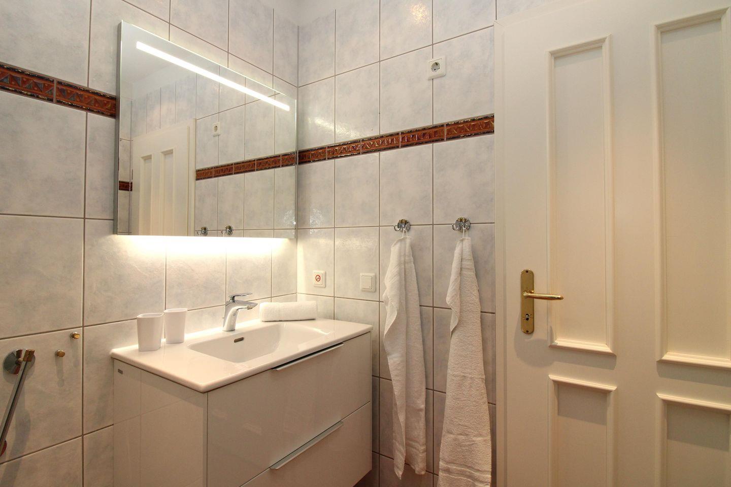 Das freundliche Badezimmer verfügt über eine Dusche, einen Waschtisch mit beleuchtetem Spiegel und geräumigem Unterschrank, WC und Handtuch-Heizkörper sowie ausreichend Ablagemöglichkeiten.