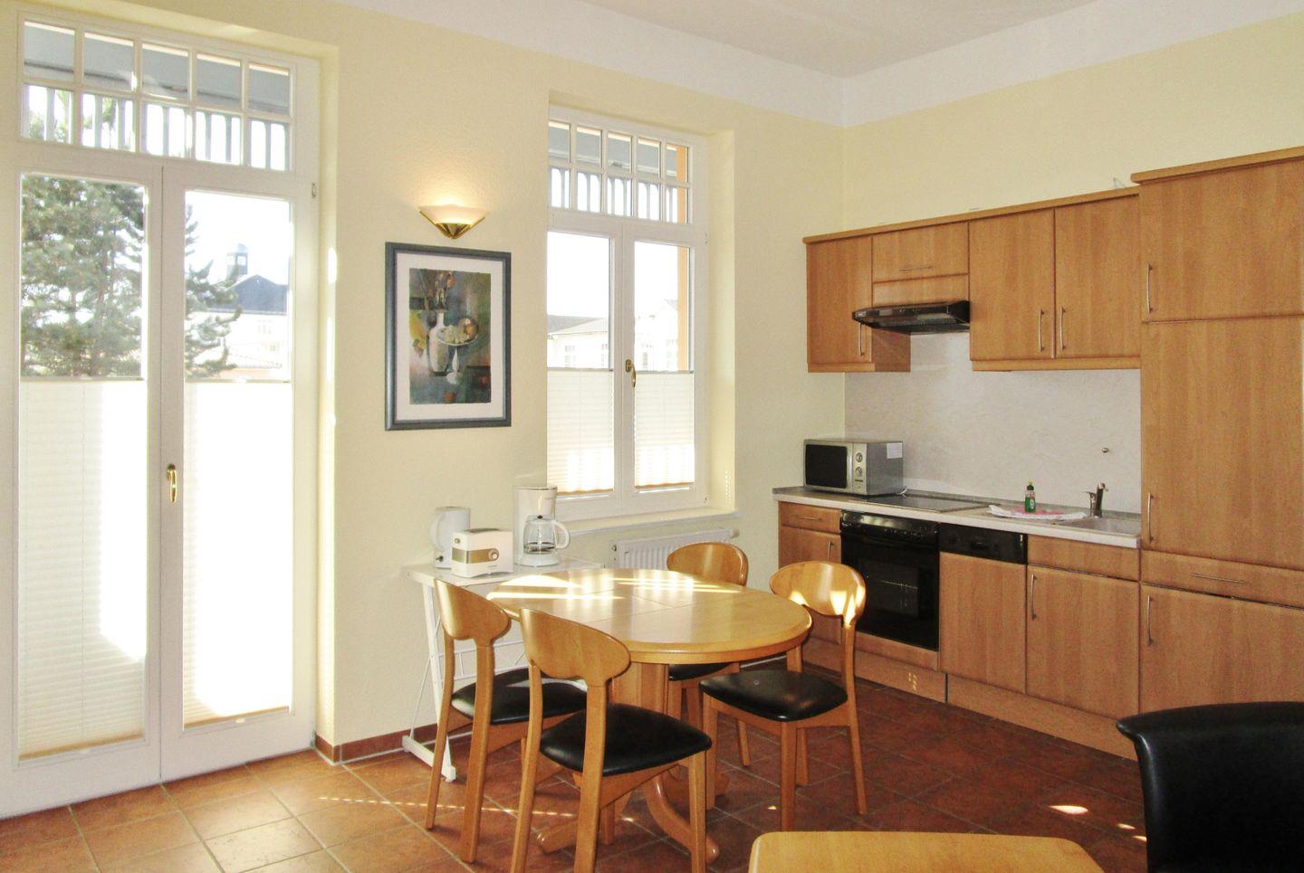 Der offene Küchenbereich beinhaltet eine voll ausgestattete Einbauküchenzeile mit 4-Zonen-Ceran-Kochfeld, Backofen, Dunstabzug, Mikrowelle, Kühlschrank mit Gefrierfach, Geschirrspülmaschine, Kaffeemaschine, Wasserkocher und Toaster. Die Küche ist mit Geschirr, Gläsern, Besteck und Töpfen bestens und vollständig ausgestattet.