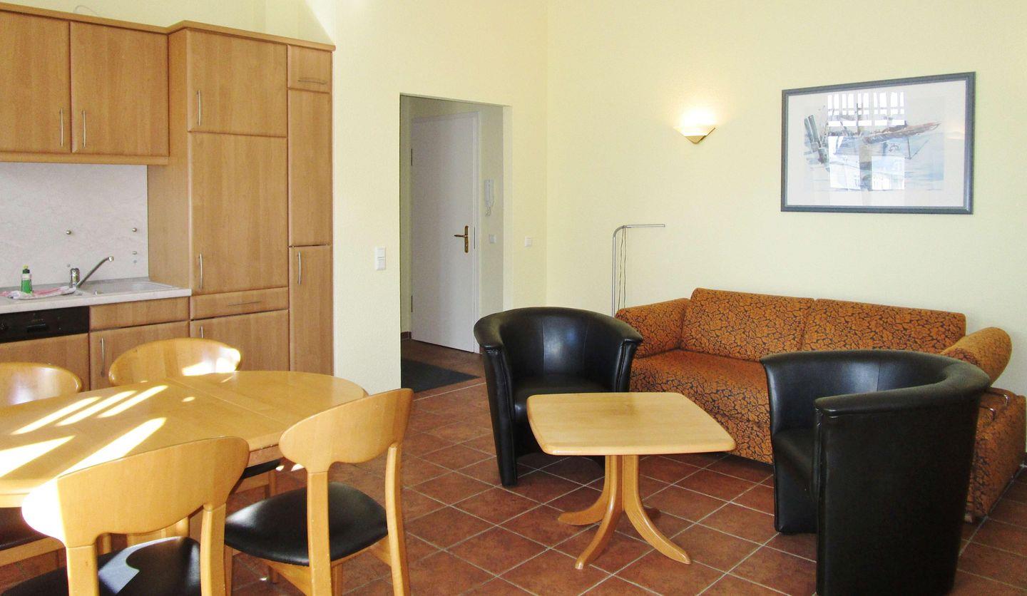 Das freundliche und lichtdurchflutete Wohn-/Esszimmer verfügt über eine separate Sitzgruppe mit bequemer (ausziehbarer Schlaf-)Couch, 2 Sesseln und Couchtisch, einen Wohnzimmerschrank, ein Sideboard sowie einen Esstisch mit 4 Stühlen. Vom Wohnzimmer aus haben Sie direkten Zugang zu dem ca. 9 m² großen, sonnigen und überdachten Balkon (nach Süden ausgerichtet) mit Balkonmöbeln und Sonnenliegen. Hier sitzen Sie entspannt und gemütlich und können abends bei einem guten Glas Wein in Ruhe die lauen Sommernächte genießen!