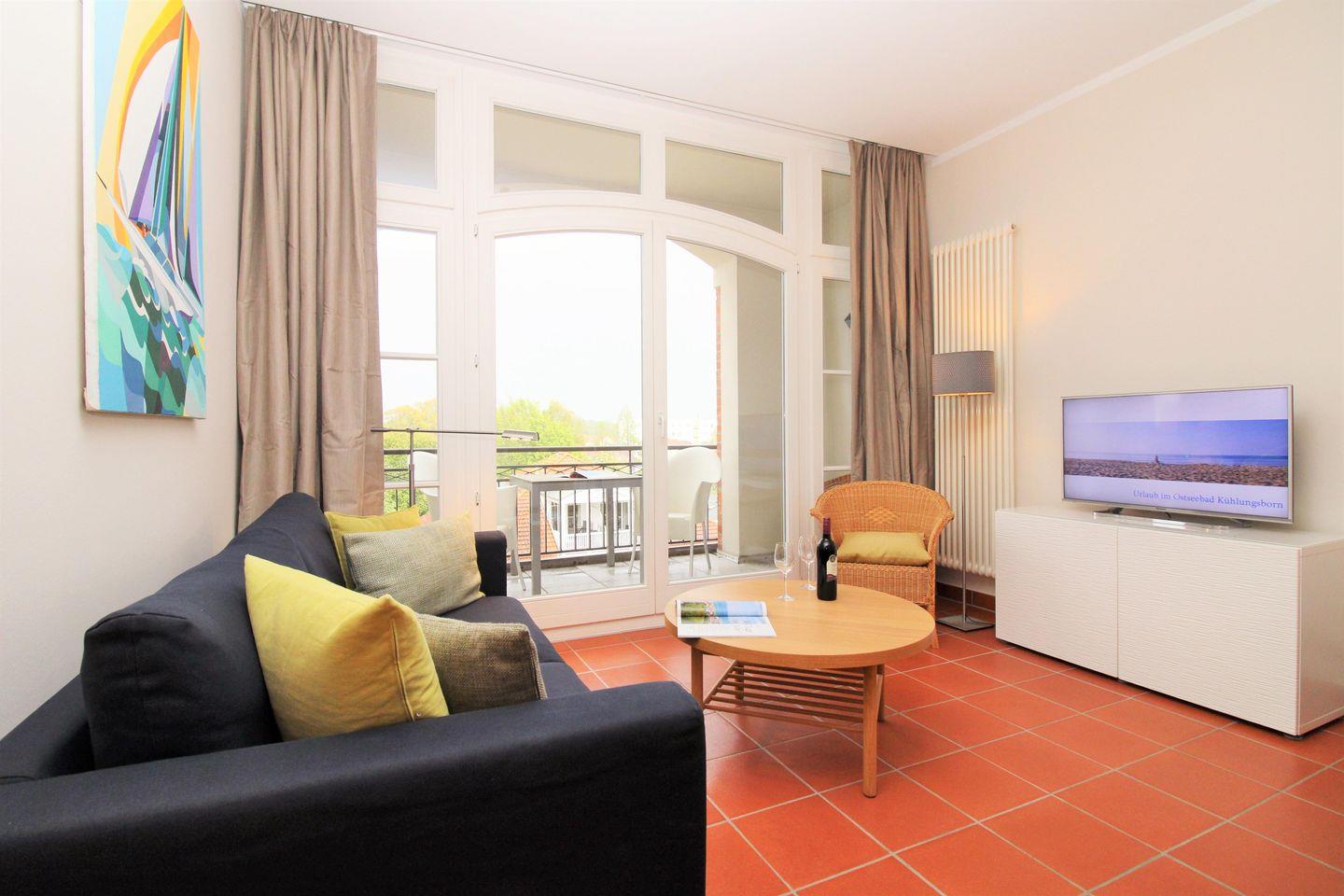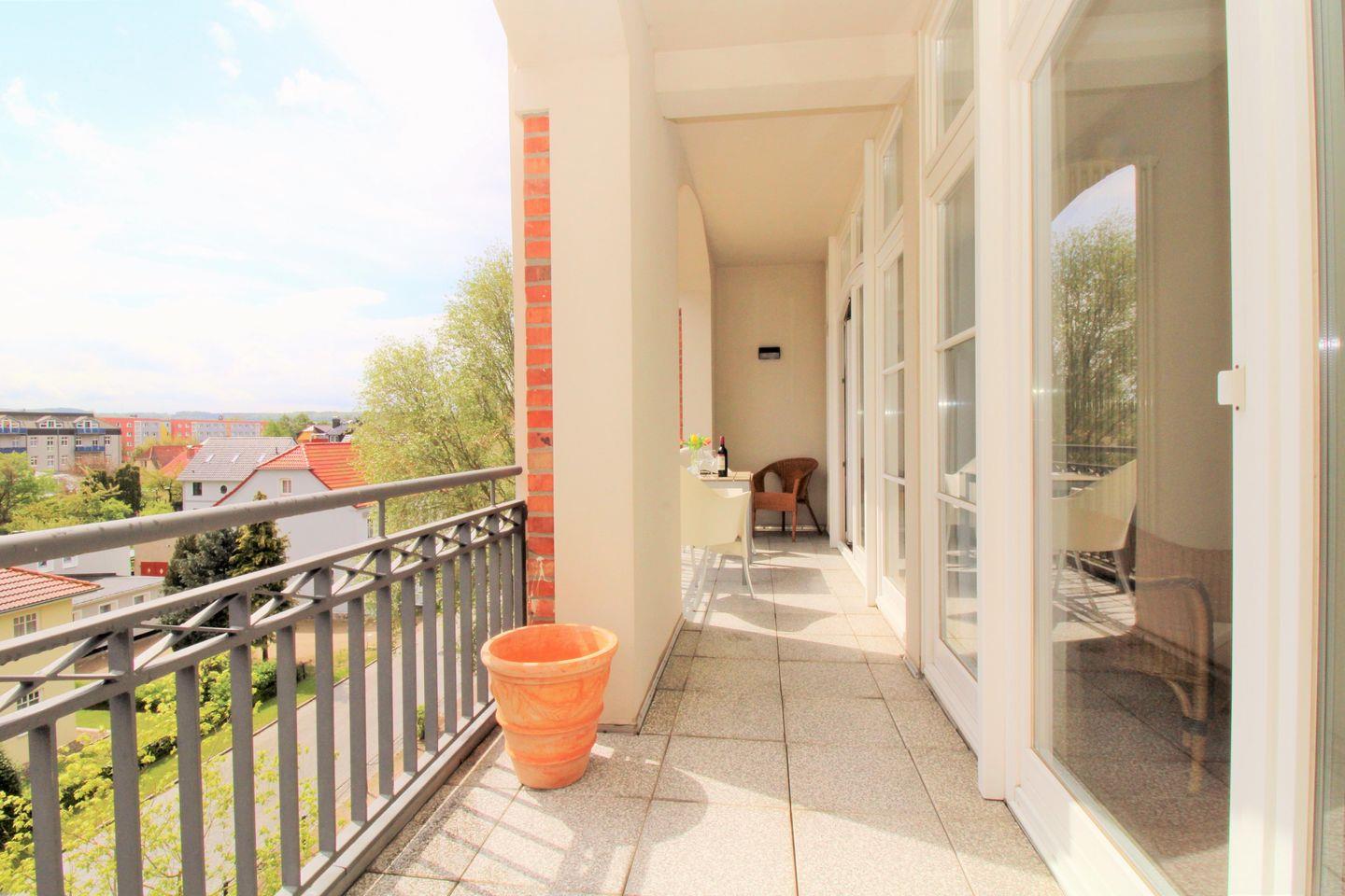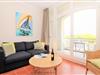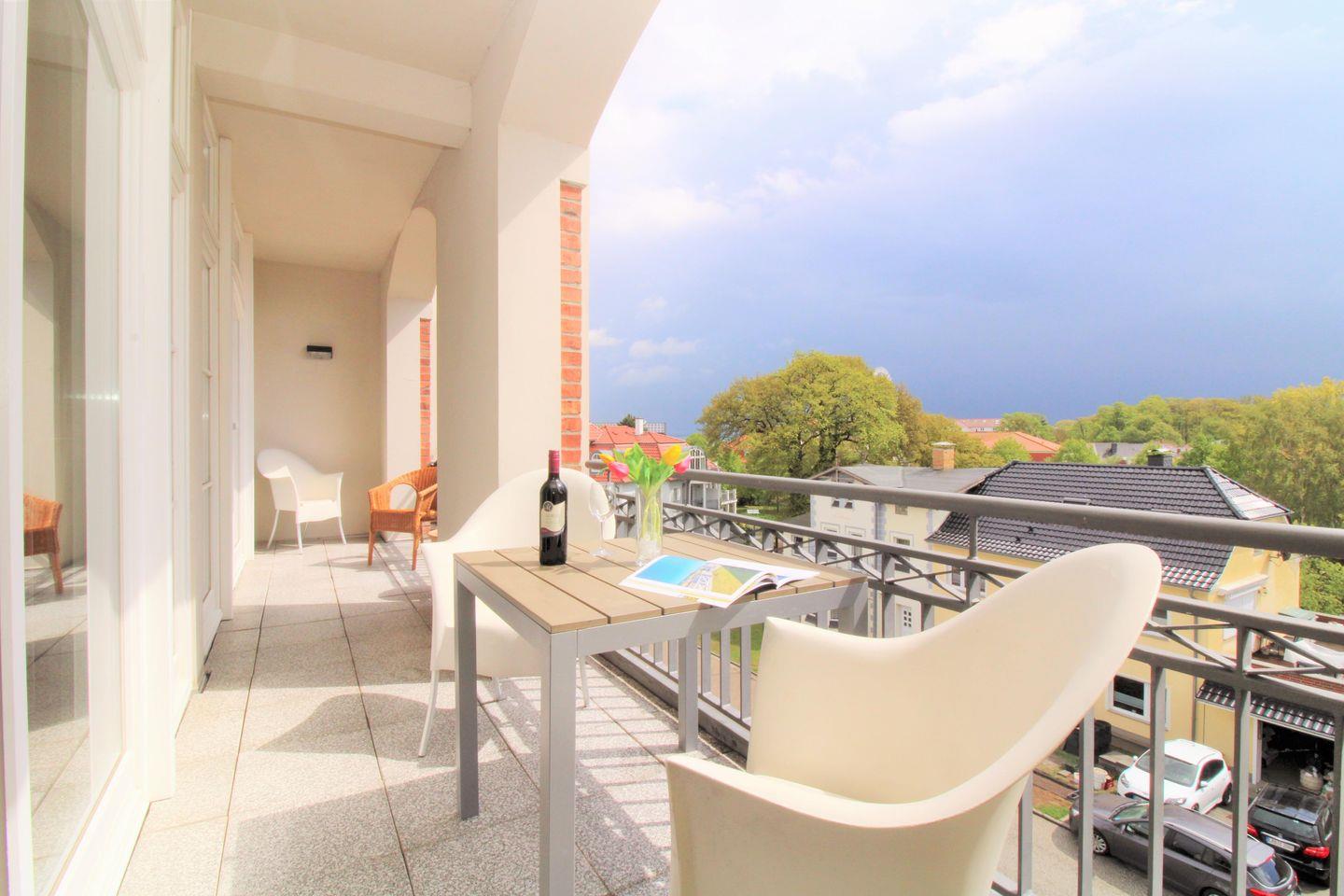 Das moderne und sehr geräumige Wohn-/Esszimmer verfügt über eine separate Sitzgruppe mit bequemer Couch, 2 Sesseln und Couchtisch, einen separaten Esstisch mit 4 Stühlen sowie 2 Sideboards. Vom Wohnzimmer aus haben Sie direkten Zugang zu der großen und sonnigen Loggia (nach Süd-Osten ausgerichtet) mit herrlichem Blick auf die nahe Ostsee. Hier sitzen Sie entspannt beim Frühstück oder können abends bei einem guten Glas Wein die lauen Sommernächte genießen …!