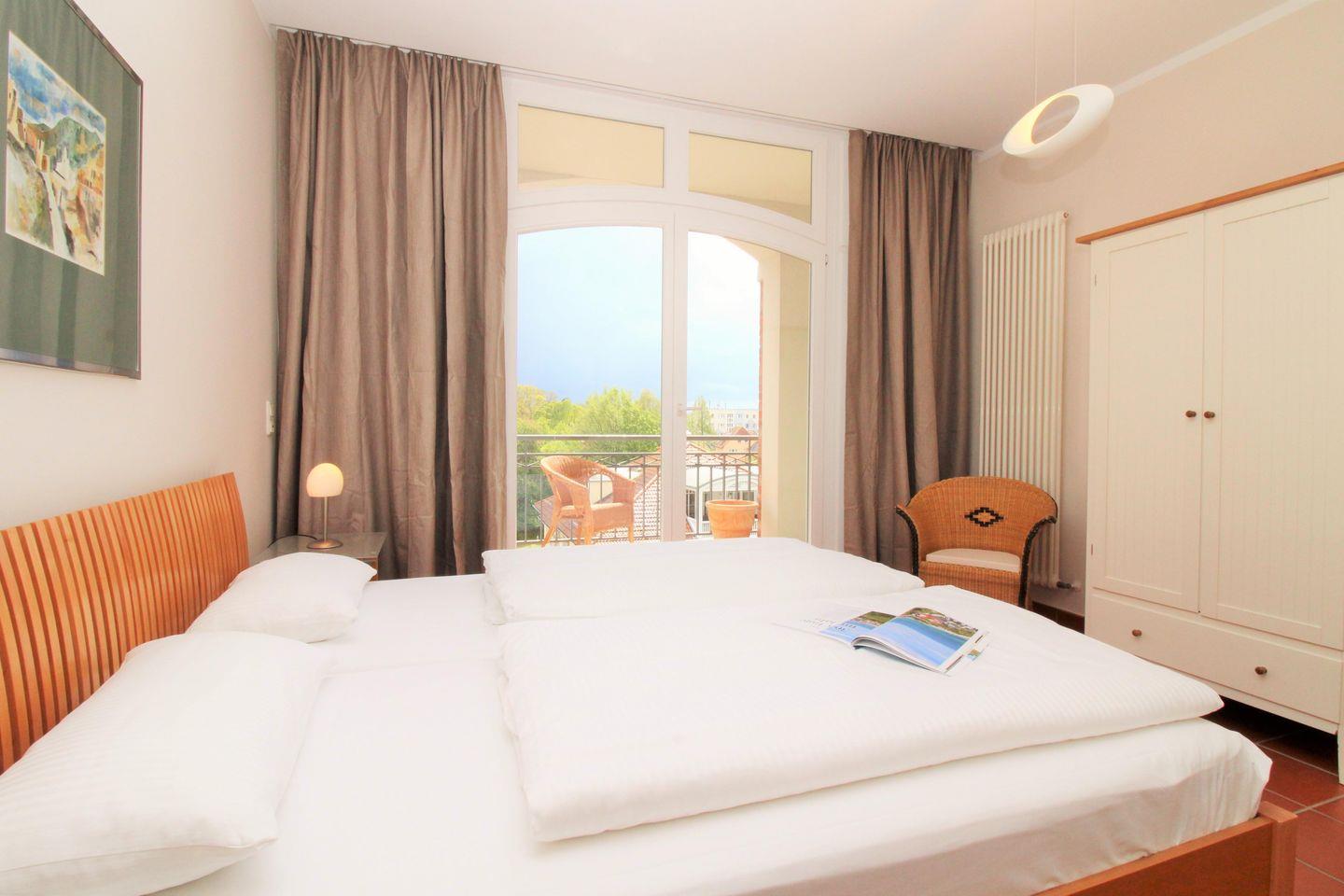 Das großzügige und helle Schlafzimmer ist mit einem bequemen Doppelbett, Nachttischen, einer Kommode sowie einem geräumigen Kleiderschrank eingerichtet. Von hier aus haben Sie ebenfalls Zugang zur Loggia. Eine zusätzliche bequeme Schlafmöglichkeit für eine weitere 3. Person bietet die ausziehbare Schlafcouch im Wohnzimmer.