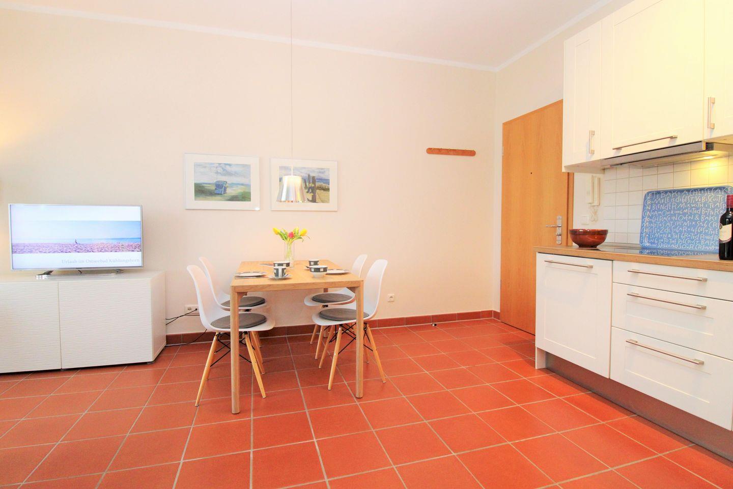 Die offene Küche beinhaltet eine voll ausgestattete Einbauküchenzeile mit 4-Platten-Ceran-Kochfeld, Mikrowelle, Dunstabzugshaube, Kühlschrank, Geschirrspülmaschine, Kaffeemaschine, Wasserkocher und Toaster. Die Küche ist mit Geschirr, Gläsern, Besteck und Töpfen bestens und ausreichend ausgestattet.