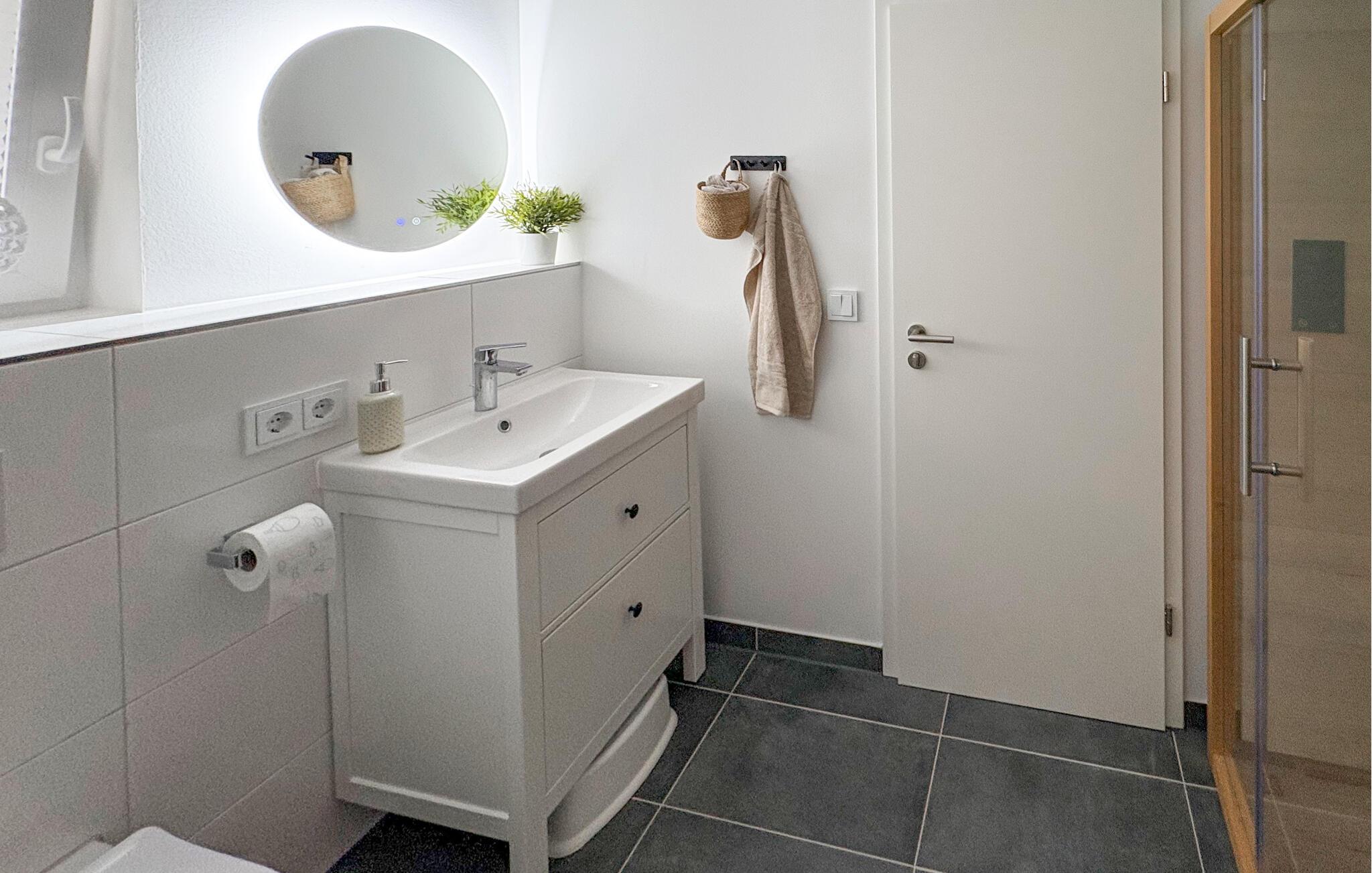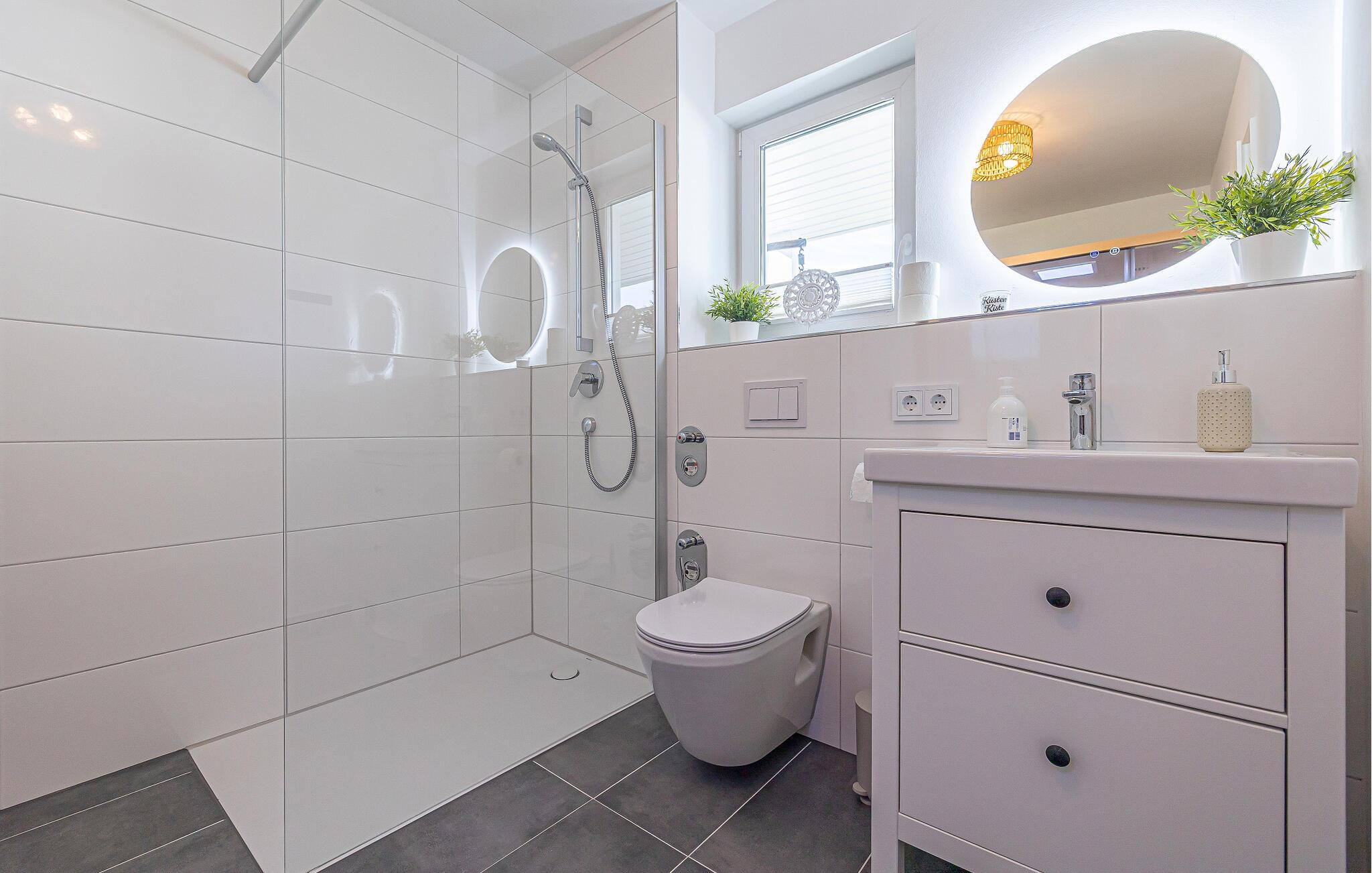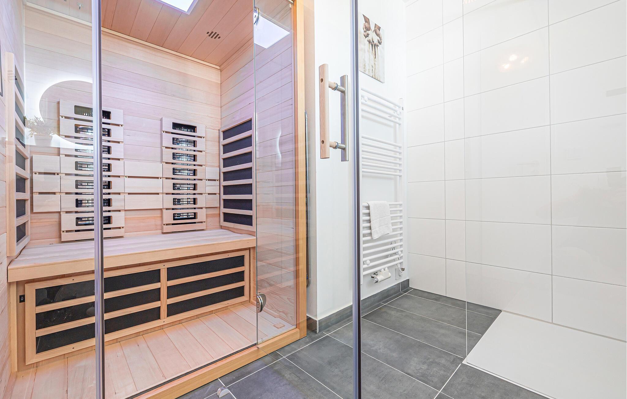 Et brusebad med bruser i gulvniveau, infrarød sauna (varmekabine) og gulvvarme i hele lejligheden fuldender tilbuddet og gør en ferie i den kolde årstid attraktiv.