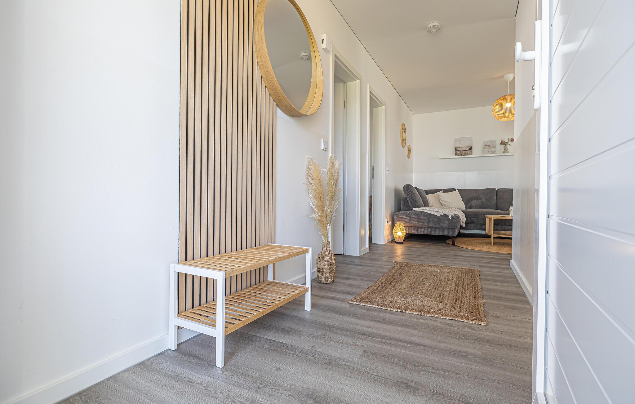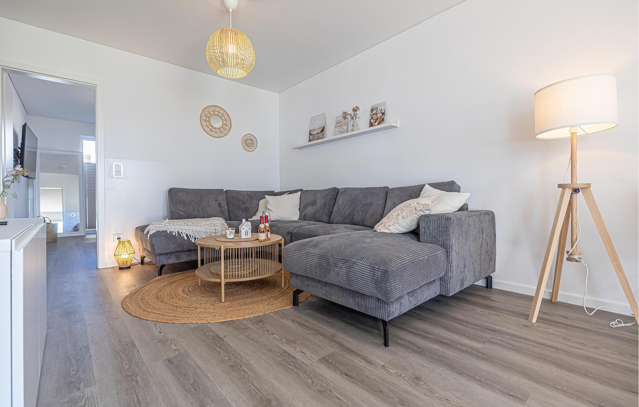 Når man træder ind i ferielejligheden, falder den hyggelige opholdsstue straks i øjnene med sin hyggelige opholdsstue. Den perfekte oase til afslappende familieaftener.