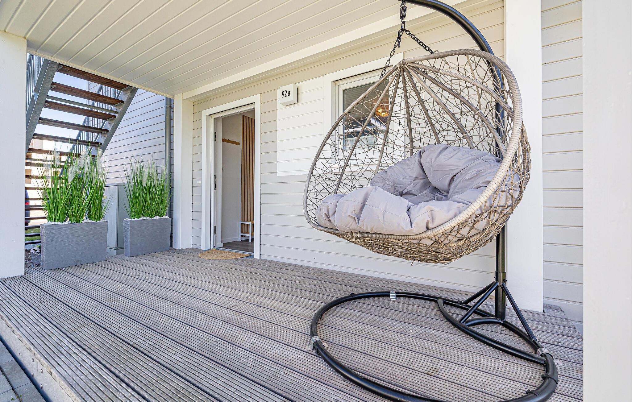 lige ud til siden af ??opholdsstuen, der er indrettet i skandinavisk stil, ligger den store terrasse, som lægger op til solbadning og afslapning. Lejlighedens terrasse tilbyder også aftensol. Eller vil I hellere tilbringe en aften sammen med at spille brætspil og lave mad?