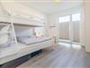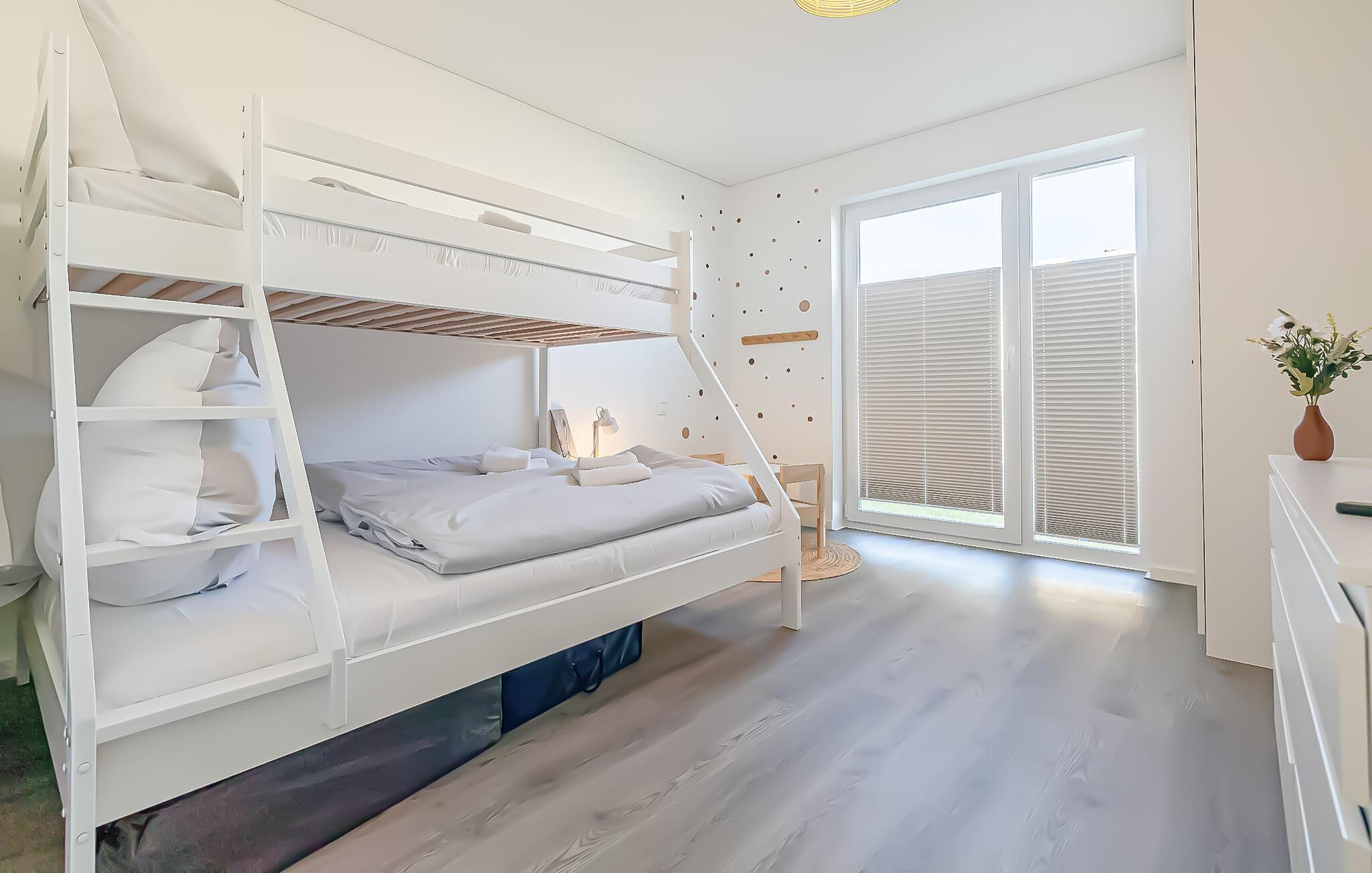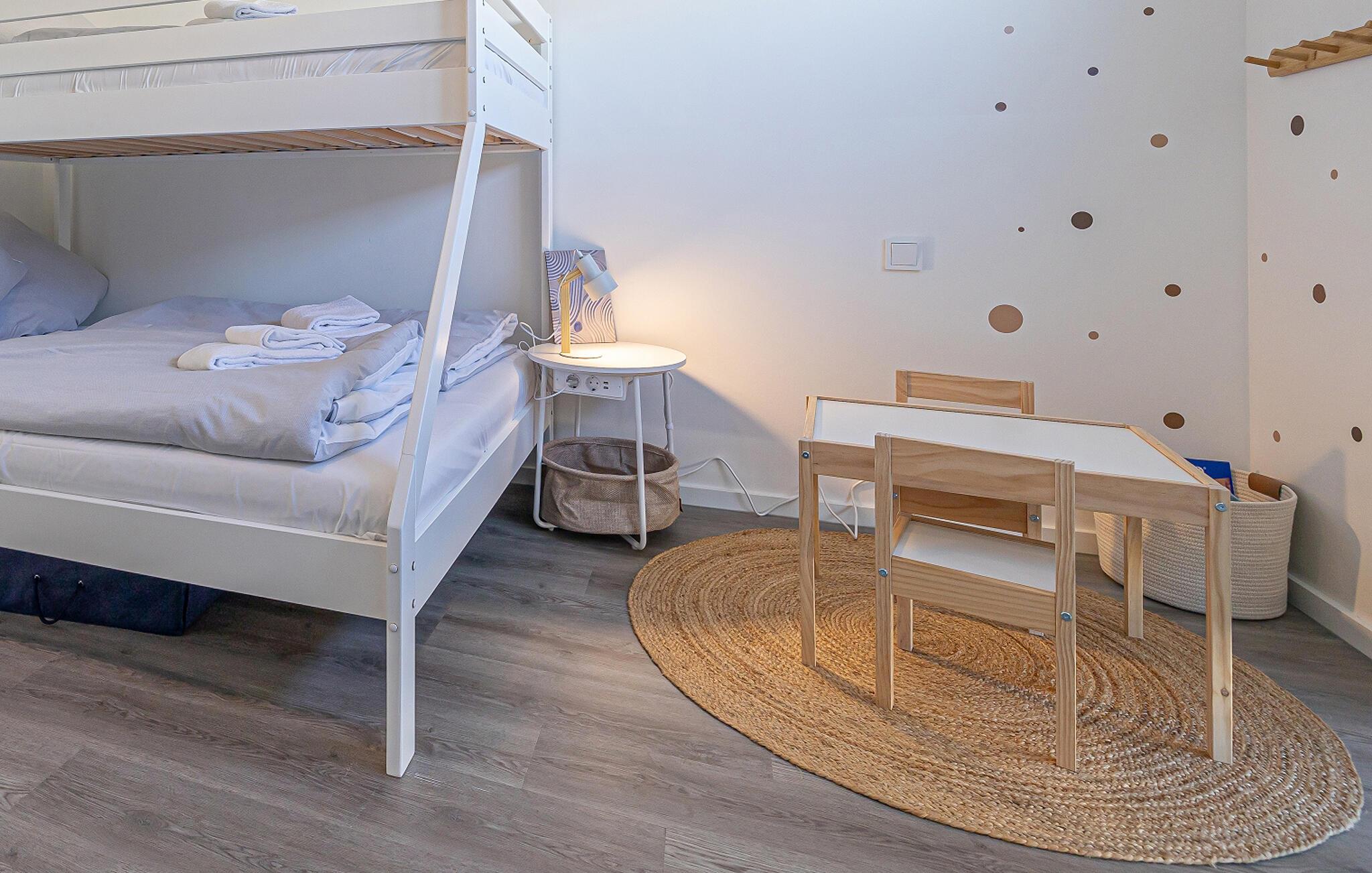 Ferielejligheden har i alt to soveværelser. En af dem er udstyret med en dobbeltseng og en med en køjeseng med tre sovepladser, herunder en rummelig dobbeltseng forneden og en enkeltseng foroven. Der er også et lille legeområde for børn.