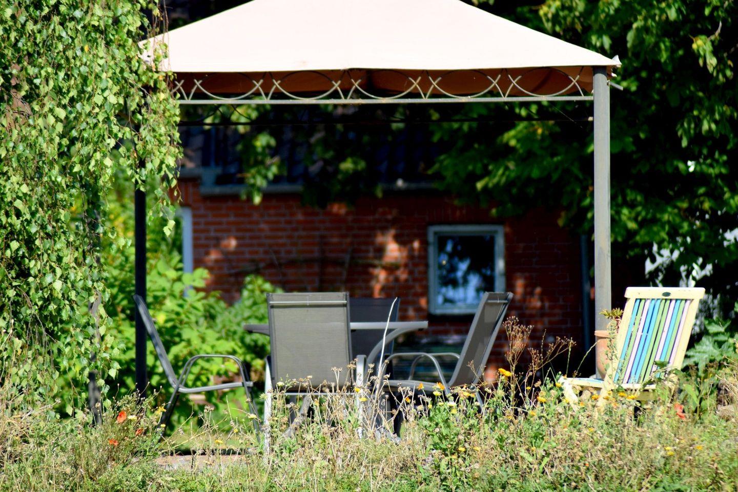 Der große idyllisch anmutende Garten mit Terrasse, Sitz- und Grillmöglichkeiten wird von Gästen und Eigentümern der Anlage gemeinsam genutzt.