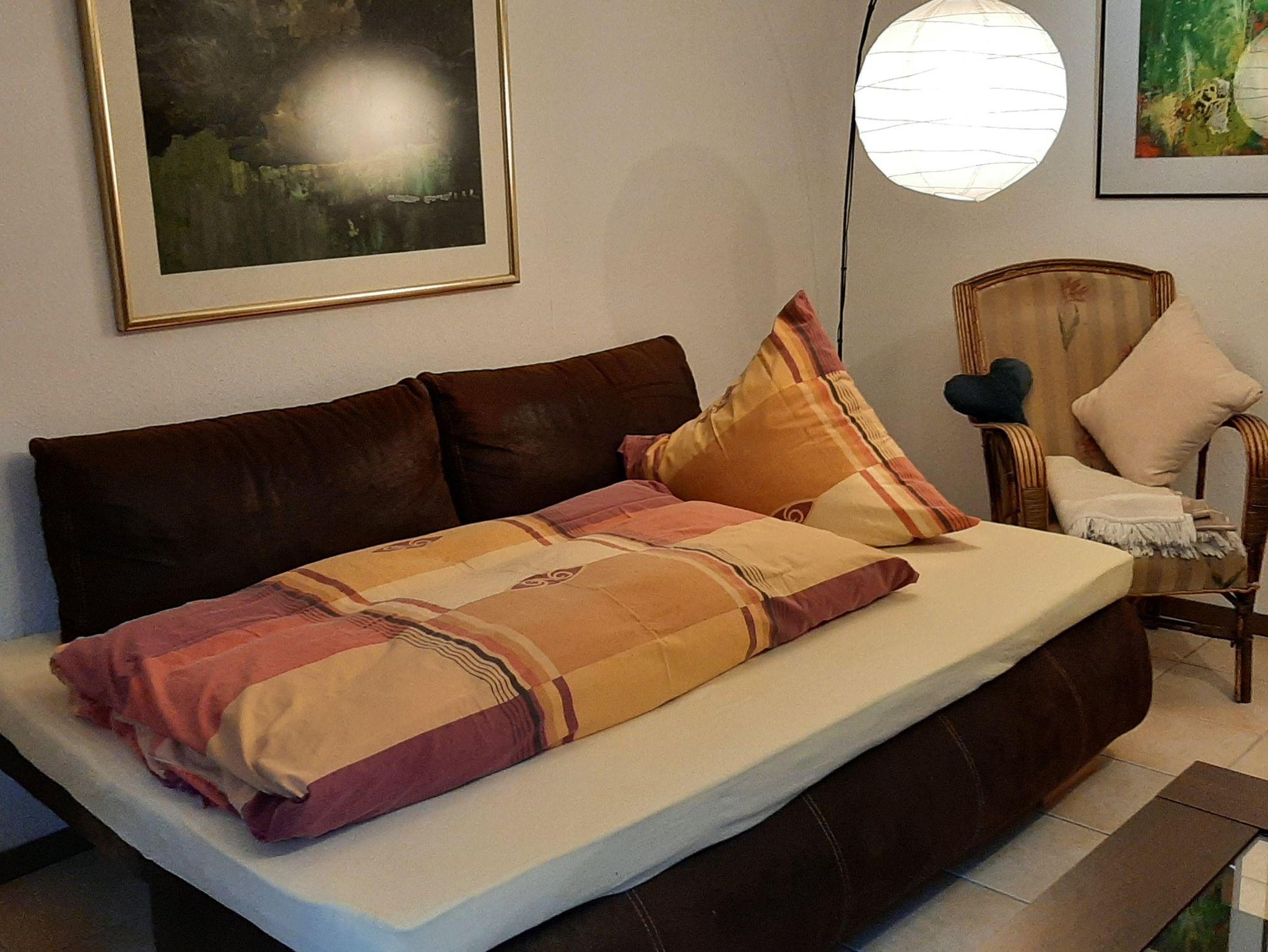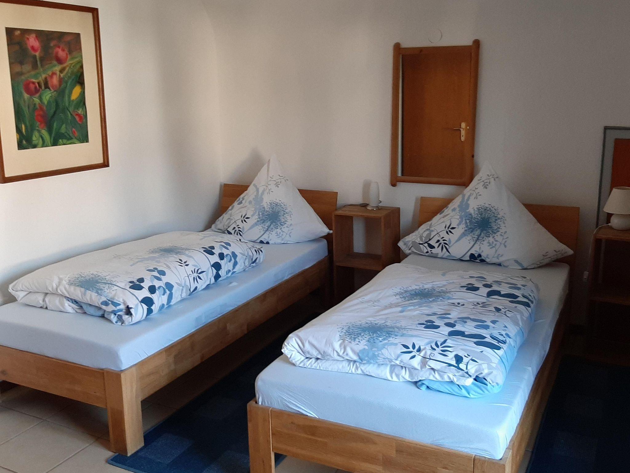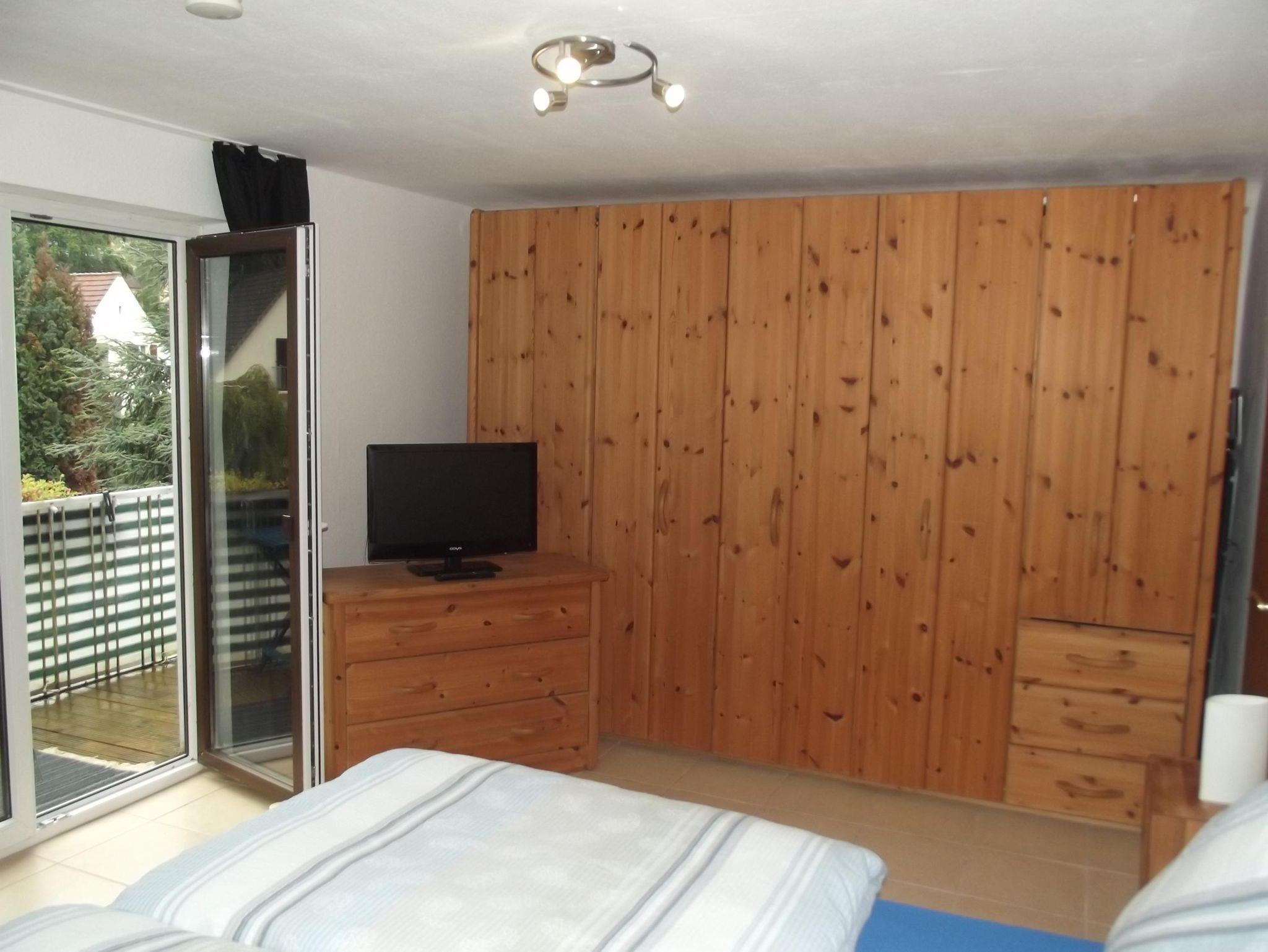 Die ca. 65 qm große Ferienwohnung befindet sich im Dachgeschoss des Mehrfamilienhauses. Der separate Zugang erfolgt über eine Außentreppe. Die Wohnung verfügt über ein Wohn-/Schlafzimmer mit Balkon, ein Schlafzimmer mit Doppelbett und Balkon, eine gut ausgestattete Küche sowie ein Badezimmer mit Badewanne und Badewannen-Faltwand. Alle Bereiche der Ferienwohnung sind gefliest. Longstayrabatte auf Anfrage.