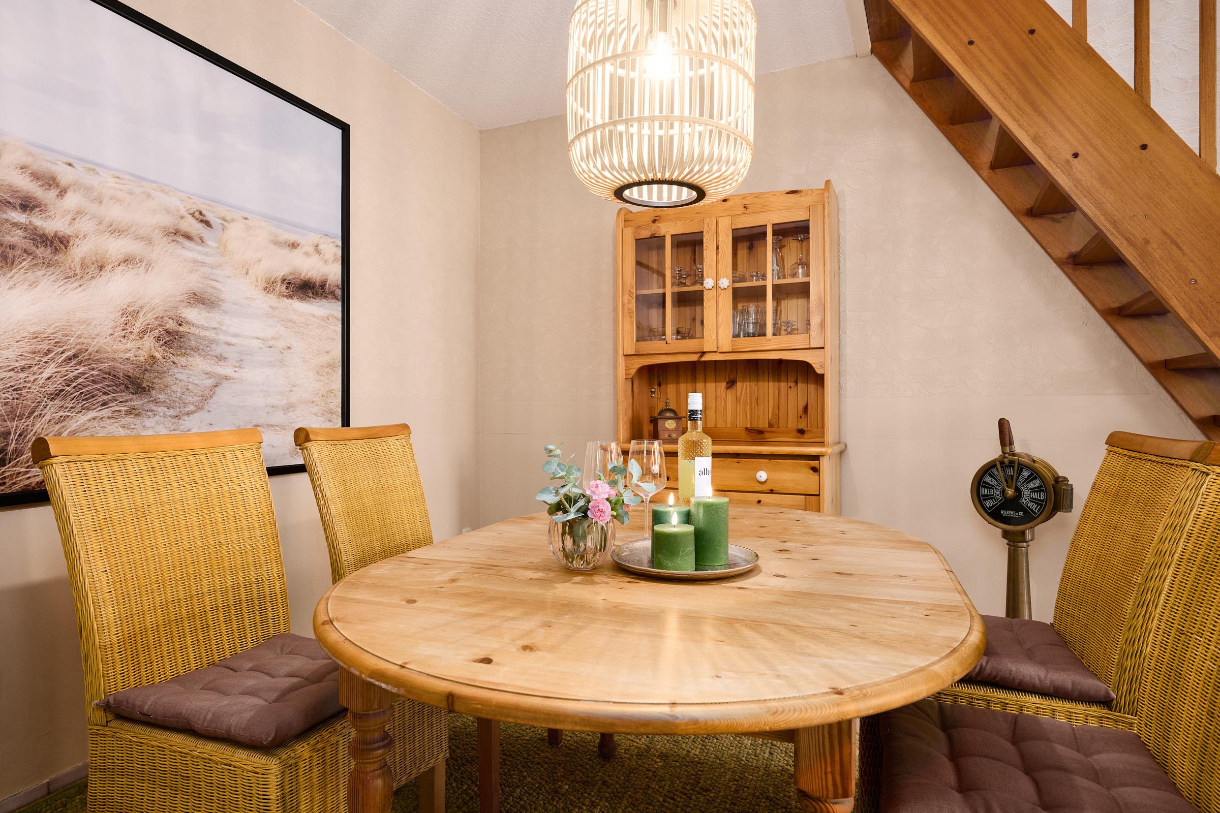 Der helle Wohnbereich lädt mit gemütlichem Sofa, Fernseher und Essbereich zum Entspannen ein. Vom angrenzenden Balkon mit Westausrichtung genießen Sie sonnige Stunden und den Blick auf das Meer. Die moderne Küche ist bestens ausgestattet mit Backofen, Geschirrspülmaschine, Kühlschrank mit Gefrierfach, Kaffeemaschine, Wasserkocher, Toaster und Mikrowelle – ideal, um auch im Urlaub komfortabel zu kochen. Im Schlafzimmer im 3. Obergeschoss sorgt ein komfortables Doppelbett für erholsamen Schlaf, ein zusätzliches Schlafsofa im Wohnbereich bietet Platz für zwei weitere Gäste. Das Badezimmer verfügt über eine Dusche (Einstiegshöhe: 4 cm), WC, Föhn und praktische Ablagemöglichkeiten.