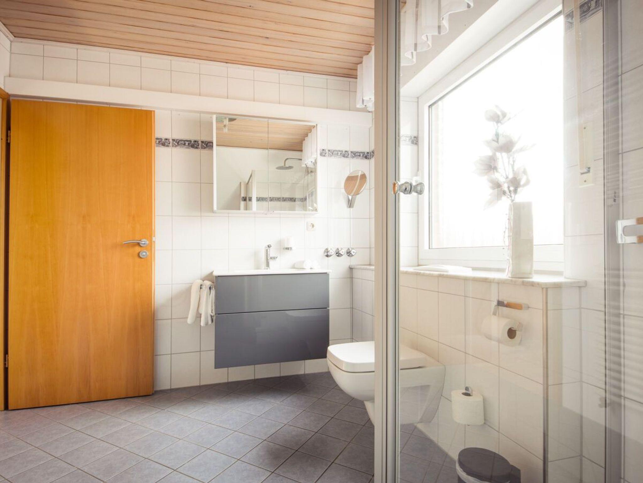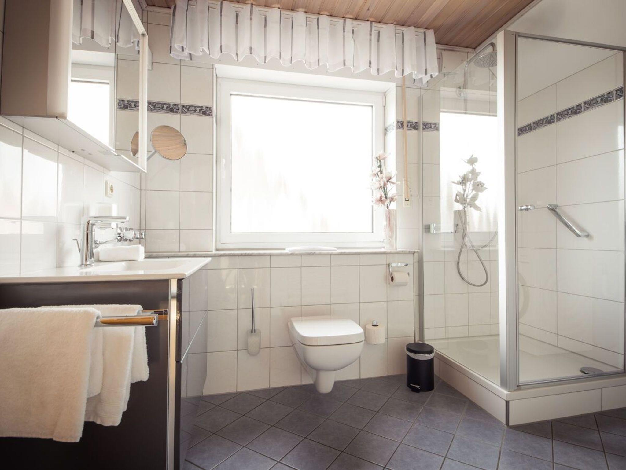 Dusche, WC, Kosmetikspiegel, Föhn, Spiegelschrank, Wandschrank (Bügelbrett,