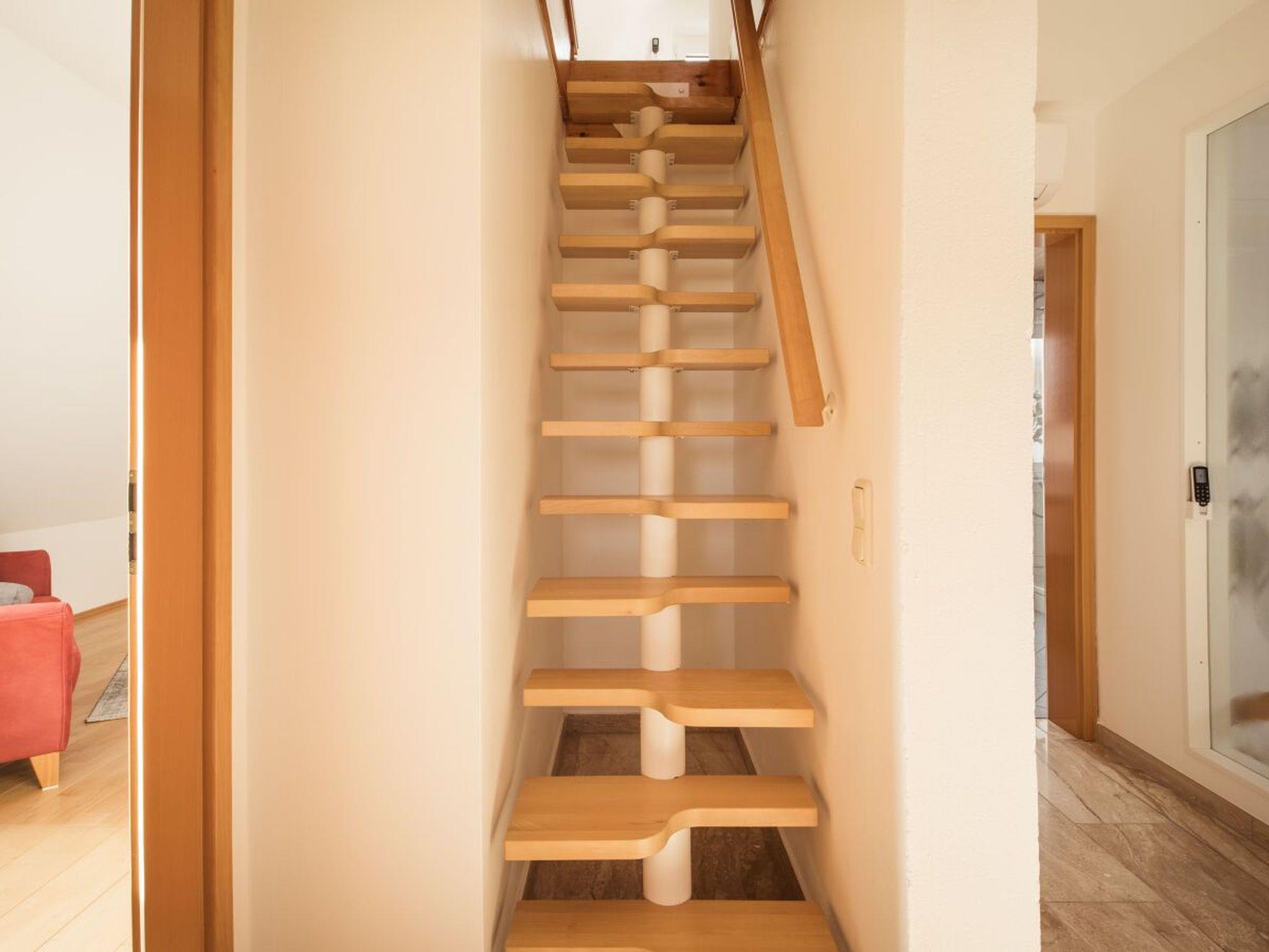 mit Waschtrockner und Föhn. Über eine steile Raumspartreppe erreichen Sie